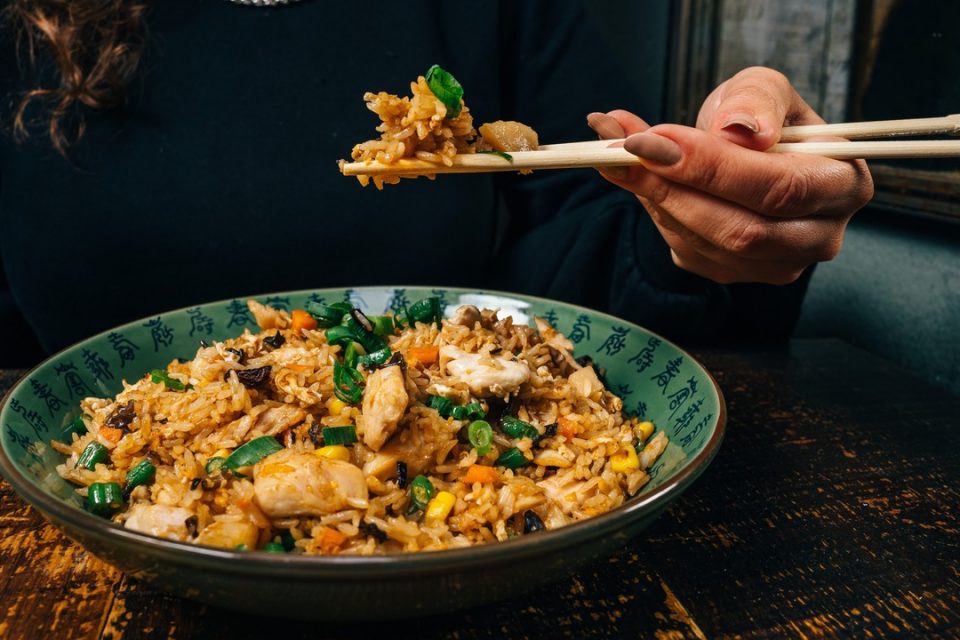 Comece por aquecer água com sal a uma temperatura de 70 graus e adicione o frango. Mexa lentamente, para que os pedaços se separarem e cozinhem igualmente. Quando o frango estiver no ponto, retire e passe por água fria (este processo irá tornar a carne bastante tenra, em vez de o cozinhar a altas temperaturas). Procure um wok ou uma frigideira antiaderente e adicione o óleo e o ovo. Mexa como se fosse fazer ovos mexidos e adicione os vegetais. Continue a mexer por mais 2/3 minutos e, de seguida, adicione o frango e o arroz pré-cozinhado a vapor. Misture bem todos os ingredientes. Quando o arroz estiver a ficar quente irá separar-se facilmente. Adicione o molho de soja e continue a cozinhar tudo de forma a o molho evaporar e o arroz secar ligeiramente. Prove e ajuste ao seu gosto. Por fim, decore com o cebolinho fresco ou coentros.