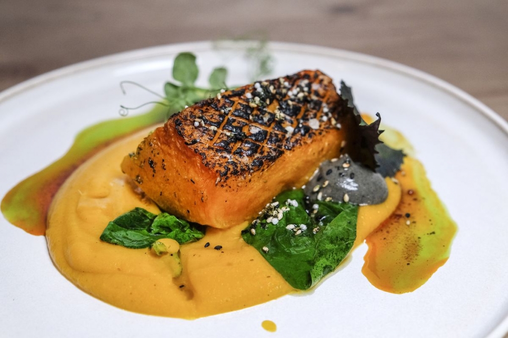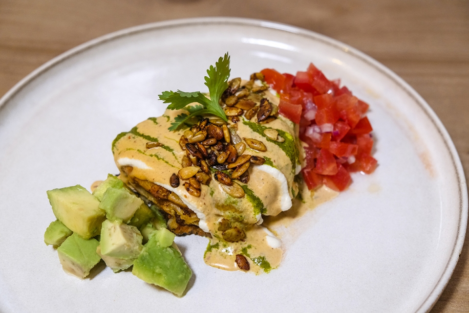 À mesa, o menu convida à partilha, a começar pela seleção de mezze com húmus, falafel, beringela grelhada e outros componentes que mudam com a estação. Muito pedida é a inchalada (lasanha mexicana), que demora três dias a fazer. A abóbora cozinhada a baixa temperatura e servida com ervas e molho miso é outro dos pratos que predispõem bem. Não menos saborosas são as sobremesas veganas. No copo, bebem-se vinhos portugueses, e em breve haverá brunch de domingo.