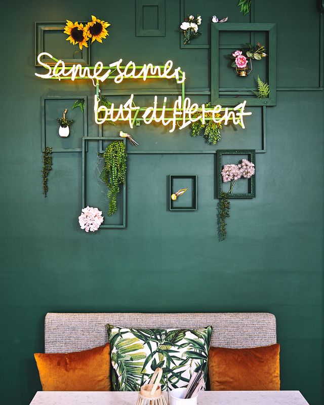 Almofadas com padrão de folhas tropicais, pássaros coloridos dentro de gaiolas, uma parede-jardim e um néon onde se lê “I like you, but don’t touch my burger” (“Gosto de ti, mas não toques no meu hambúrguer) compõem a decoração do Stay, a hamburgueria que ocupa agora o espaço do anterior restaurante português Dona Joaquina, no piso térreo do aparthotel Upon Lisbon Prime Residences.
