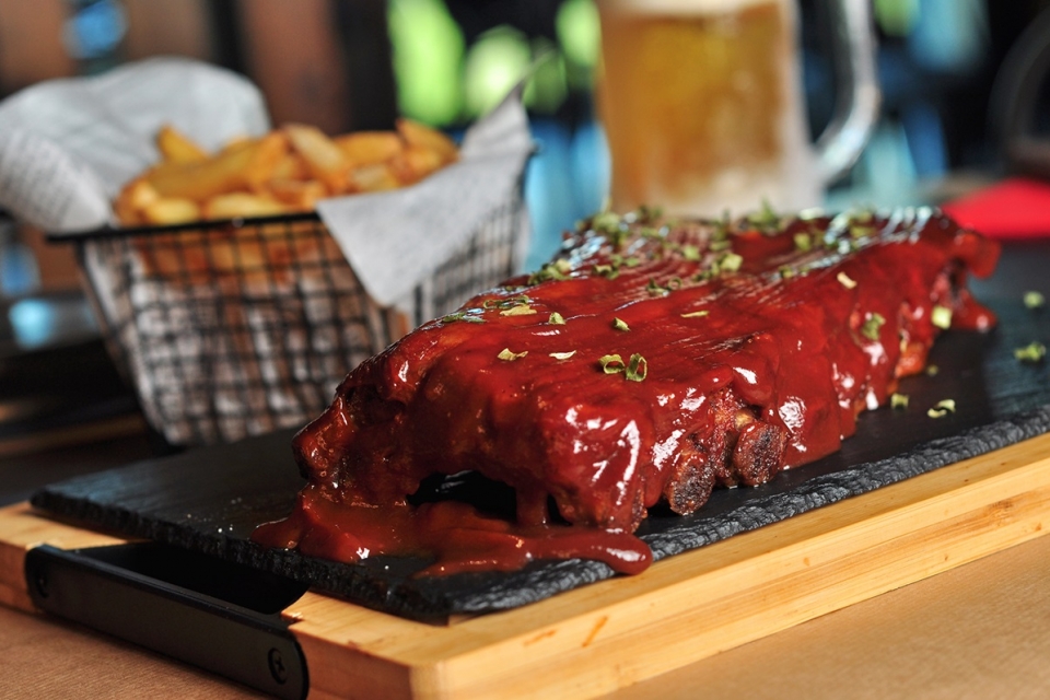 Ainda que o Fish n’ Fries tenha despertado a nossa curiosidade (um prato “para celebrar as raízes britânicas”, como é descrito), fomos para a estrela daquele restaurante: a carne. Começamos o nosso almoço com pulled Pork (8,90€ euros/4 unid), umas bolinhas de costela desfiada com recheio de cream cheese, acompanhadas de molho barbecue e com jacket potato (5,90€ euros), uma batata recheada com cream cheese e bacon.