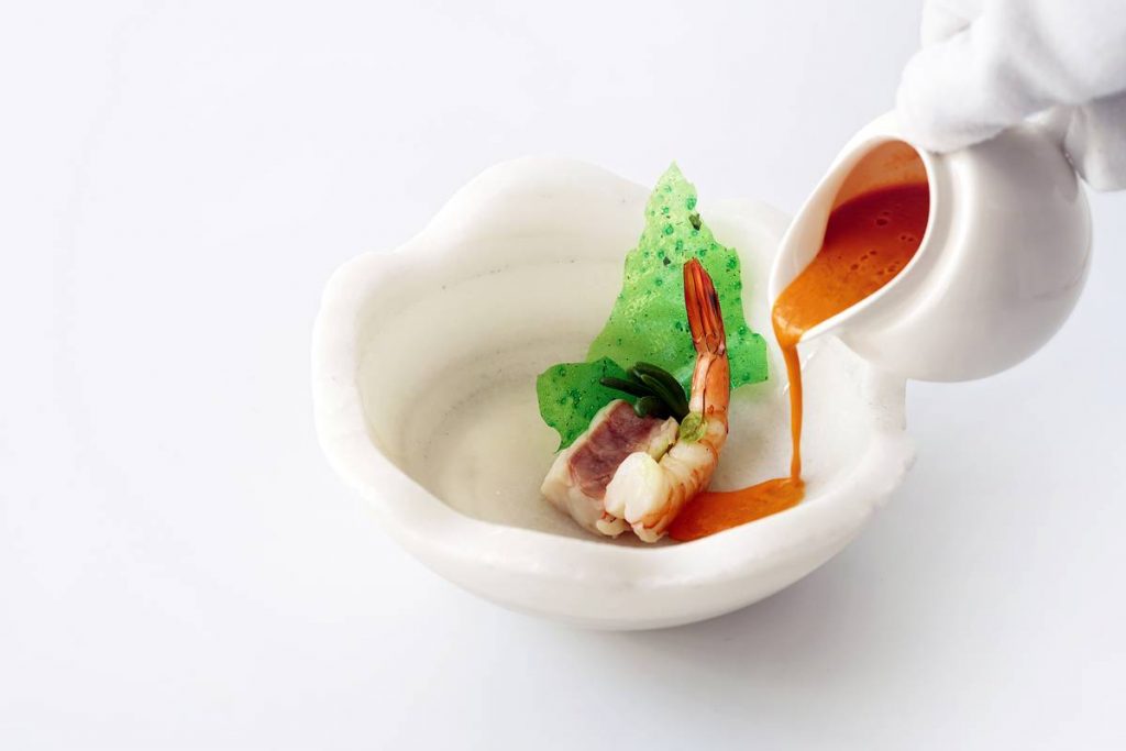 O olfato, por sua vez, é estimulado ao abrir uma caixa com fumo de partículas de carvalho francês. Lá dentro vem uma colher de presunto curado e fumado artesanalmente, com foie gras e gel de framboesa. Tudo certo para dar início a um dos menus de degustação. Fábio Alves inicia a experiência com uma vitela arouquesa desfiada, com gema de ovo e um caldo de cogumelos mourille do norte; seguindo para uma sopa de peixe inspirada nas caldeiradas de Sesimbra (onde trabalhou no hotel Sana), com robalo e camarão cozinhados em água de mar.