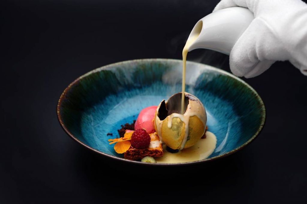 - A sobremesa de esfera de chocolate com pó de ouro. (Fotografia: DR)