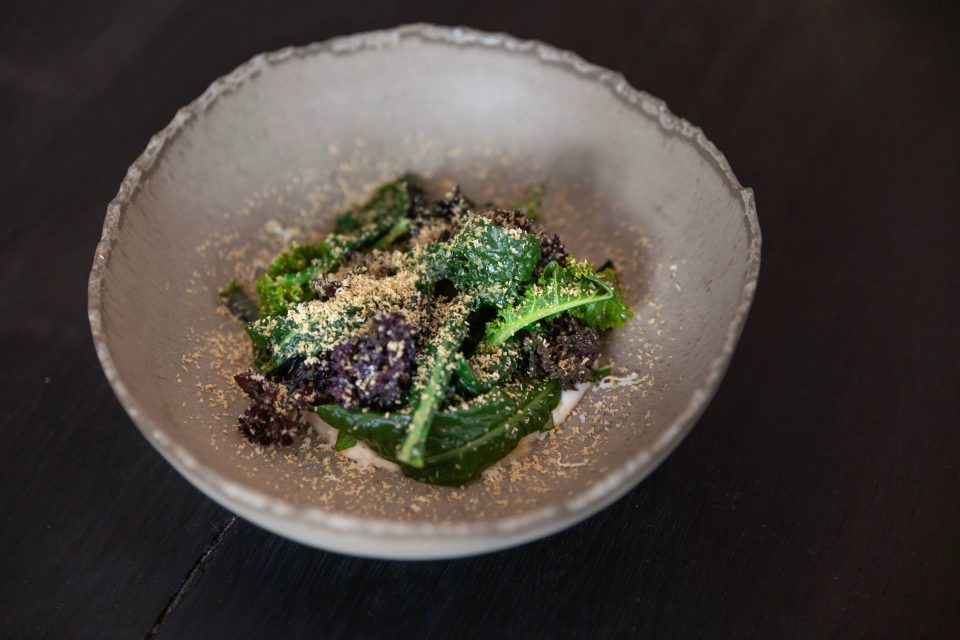 Nas entradas, chega uma delicada sopa de cogumelos com caldo de frango sobre a qual se tem de esmagar uma gema de ovo, misturando tudo. Depois, o “prato vegetal”: um creme de couve-flor com leite de amêndoa, couve kale, água de tomate fermentado e cobertura de amêndoa tostada. Já nos pratos principais, a proteína muda consoante a oferta de produtos frescos.