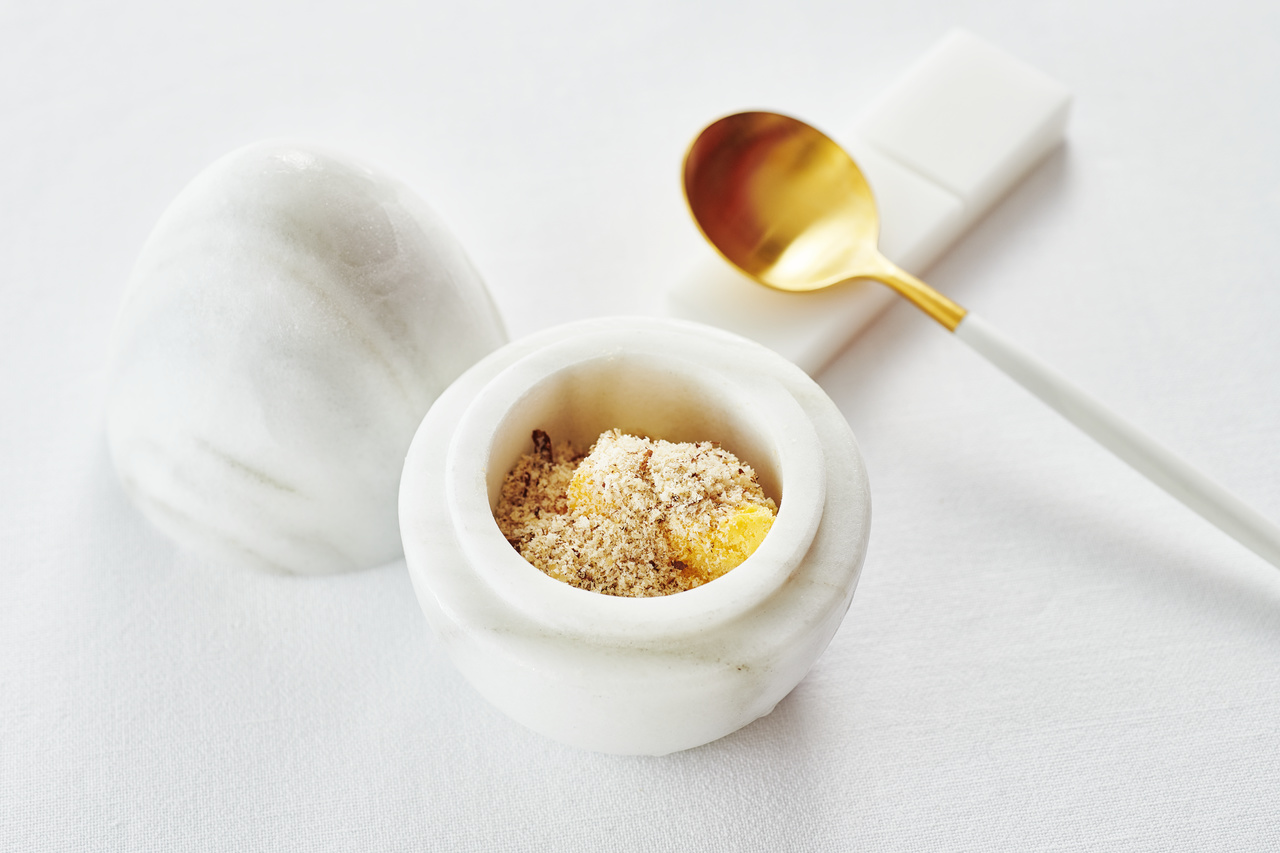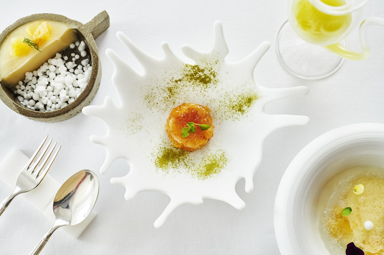 Nos pratos da terra, há lugar para uma beringela “disfarçada” de borrego e o leitão à moda da Bairrada. E nas sobremesas, o chef, natural de Aveiro, viaja até às memórias dos dias de praia na Costa Nova, com a sua recriação de ovos-moles e a famosa tripa de chocolate. A gulosa combinação termina com um refrescante ananás dos Açores com chá verde.