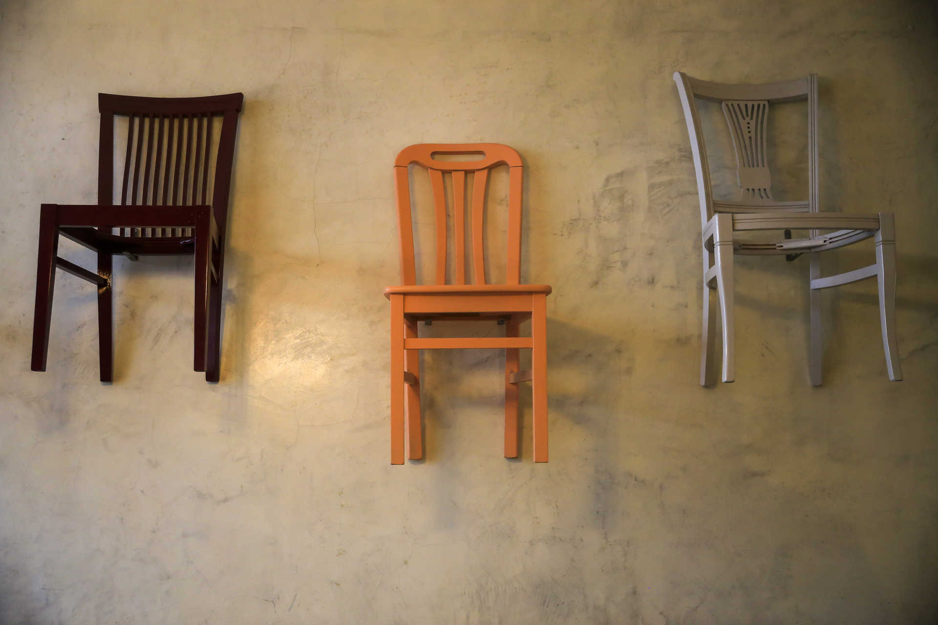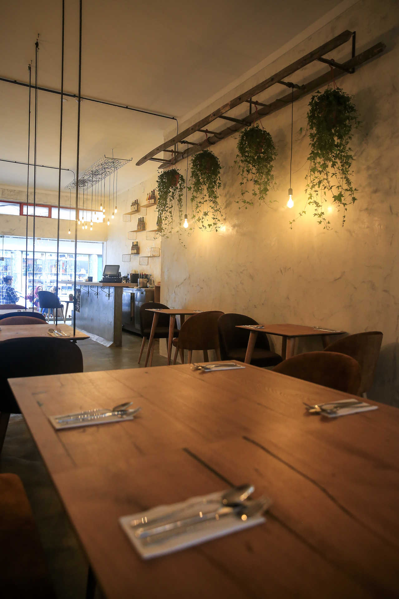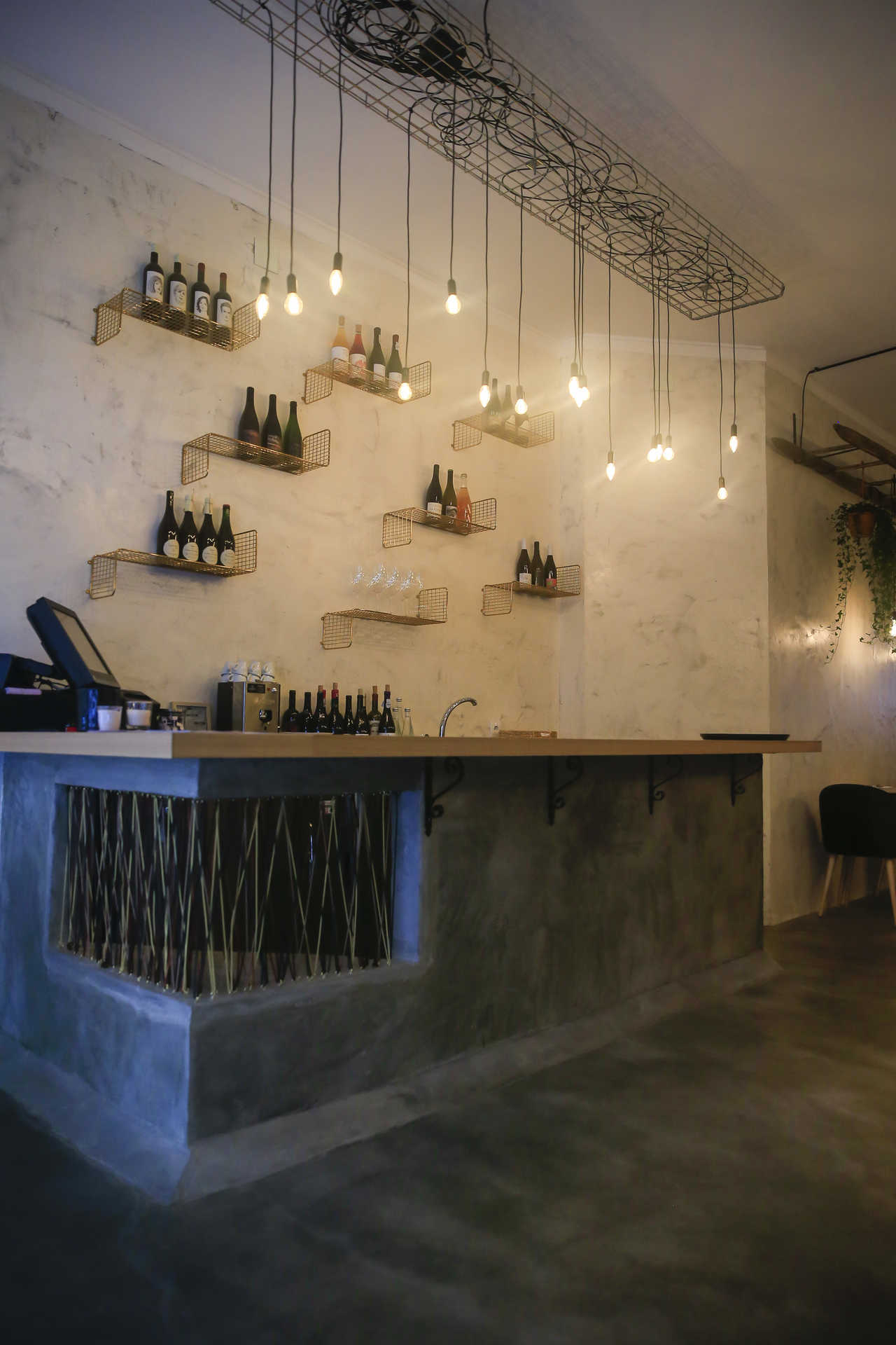 Mas ainda antes de conhecer a carta, ao passar na rua é fácil ser-se atraído pela decoração irreverente, com cadeiras penduradas nas paredes, mesas suspensas e até uma antiga escada de vindimas em madeira, pendente do teto, a denunciar o protagonismo do vinho.