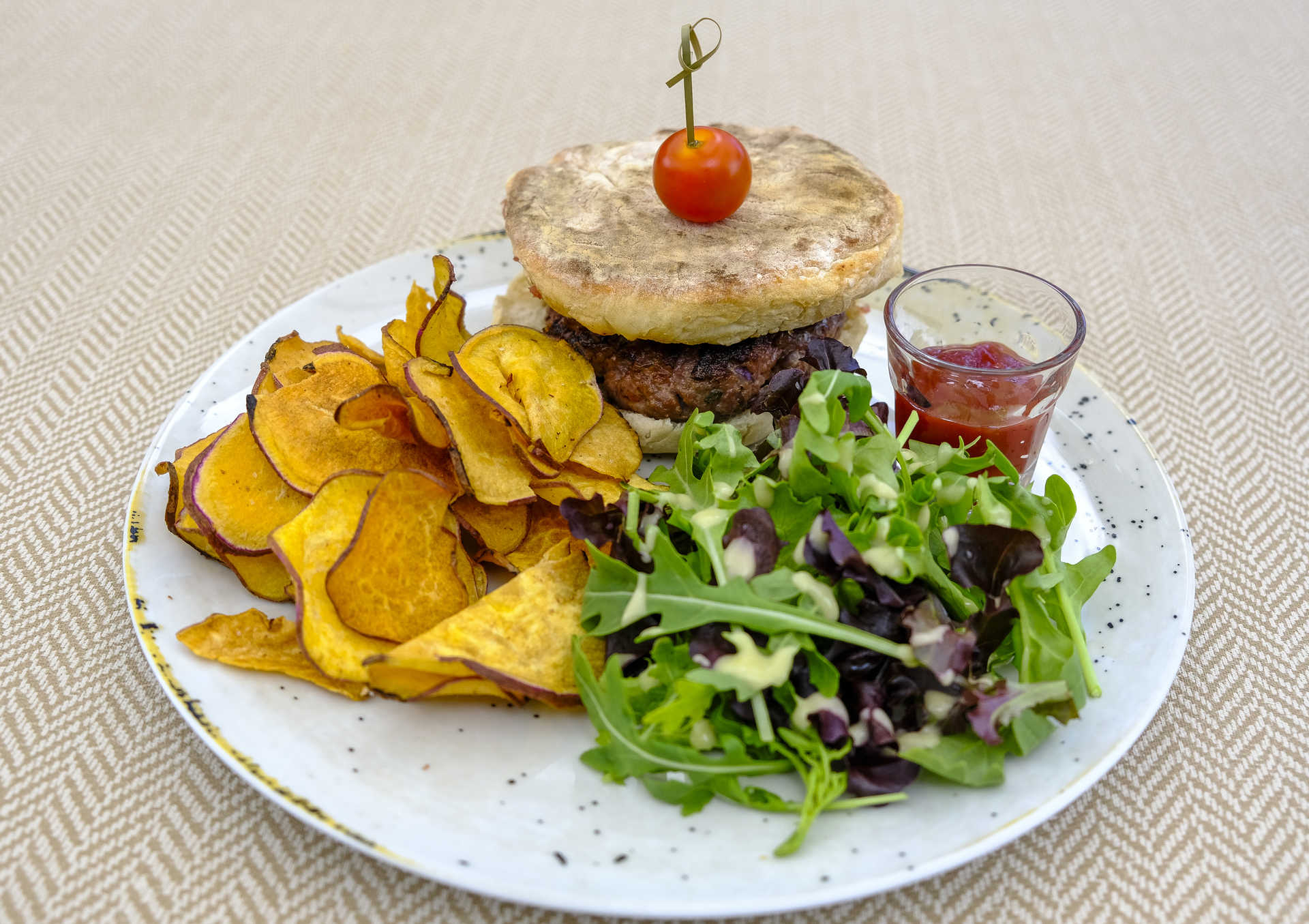 Da cozinha saem croquetes de alheira com molho de vinho do Porto e bowls de salmão fumado e abacate e de frango com molho de manga. Já no capítulo dos pratos mais consistentes, entram em cena o filete de robalo com arroz de berbigão e um irresistível caril de gambas com chutney de manga e arroz de amêndoas. Sentados na esplanada à sombra, com música ambiente, nem se dá pelo tempo passar, mas vale a pena guardar espaço para provar também o hambúrguer caseiro, servido com cebola roxa caramelizada e tomate no bolo do caco, com chips de batata-doce e salada.