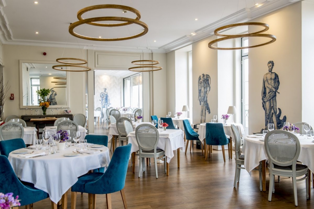 Desde outubro passado que o chef Nikita lidera as cozinhas dos Tágide, depois de ter estado quase uma década no Grémio Literário, “um segredo bem guardado no Chiado”. Não é que se tenha mudado para longe. A vantagem foi ter ganho a vista para o Tejo, a cujas tágides (ninfas) Camões apelou por inspiração para escrever Os Lusíadas. Além da vista, a sala em tons de branco e azul destaca-se pelos seus azulejos, figuras da mitologia clássica e duas fontes de pedra do século XVII.