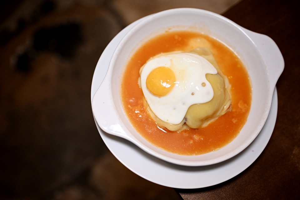 A francesinha tradicional do restaurante e o Quinta da Sequeira Reserva Branco 2021, que o proprietário aconselha para acompanhar. (Fotografias de Rita Chantre/GI)