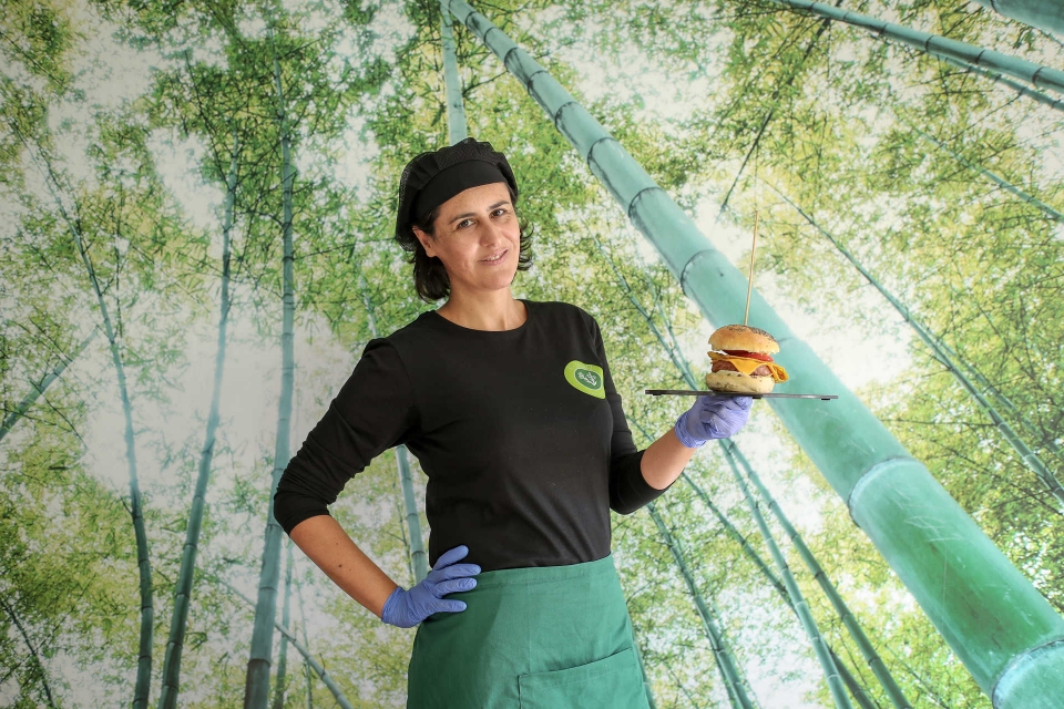 Ali, o hambúrguer é rei. O pão é de beterraba. O hambúrguer parece carne, sabe a carne, mas não é. O segredo? “Beyond Meat”, a fabricante americana que imita a carne sem usar proteína animal e que, agora, dá os primeiros passos em Portugal. Quem prova não nota a diferença, mas ali há, na verdade, proteína de ervilha. Nenhum glúten, zero soja. Depois, é queijo vegan, alface, pepino, tomate e cebola roxa. No cachorro, mudam os ingredientes, mas repete-se a receita. Há ainda pizzas, rissóis e folhados. Para a sobremesa, mousse de chocolate, pudim de laranja e um bolinho.