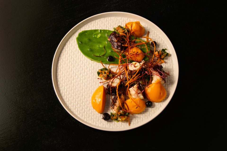 Após alguns testes acharam, e bem, que combinava com polvo, que é aqui cozido lentamente por duas horas antes de ir a assar. Ao duo junta-se ainda a batata-doce em três texturas (frita, em puré e esferificada com topinambo), a salsa crioula e, outro detalhe inusitado, picles de mirtilos — à falta das bagas do arbusto Calafate-da-patagónia, os mirtilos, com um toque de alfazema, proporcionam um resultado final muito interessante.