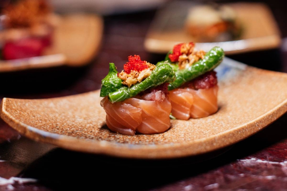 Composto por sete momentos, da entrada à sobremesa, o menu Omakase, dimensionado para uma pessoa (50 euros sem bebidas) começa com uma dose de edamame trufado (a vagem de soja, muito consumida nas izakayas,. ou tabernas japonesas). Depois, o cliente é convidado a escolher outras duas entradas, entre as seguintes opções: taco Sakana (peixe branco e guacamole, entre outros ingredientes) ou temaki de salmão; gyosa ou ika crispy (isto é, uma taça de lulinhas fritas no ponto, acompanhadas de maionese de especiarias).