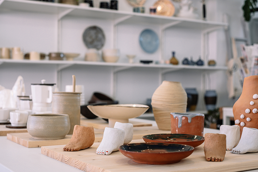 Canecas, jarros e pratos da Malga, terrinas do Mestre Cabecinhas, um serviço de café da Miyaya e os pés que são vasos da Barro Alto são algumas das peças utilitárias presentes na loja, onde convivem com as figuras mais artísticas da Tosca.Lab e a peça António Variações de Alexandre da Silva.