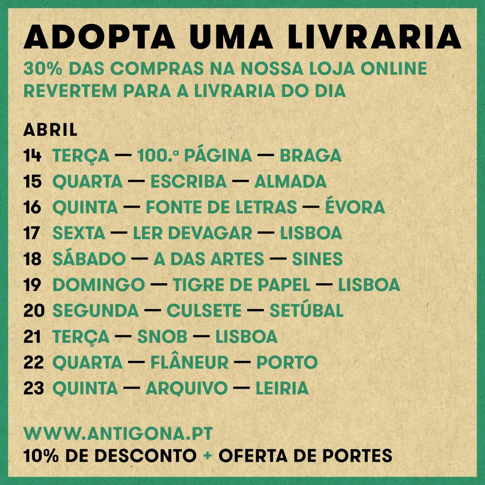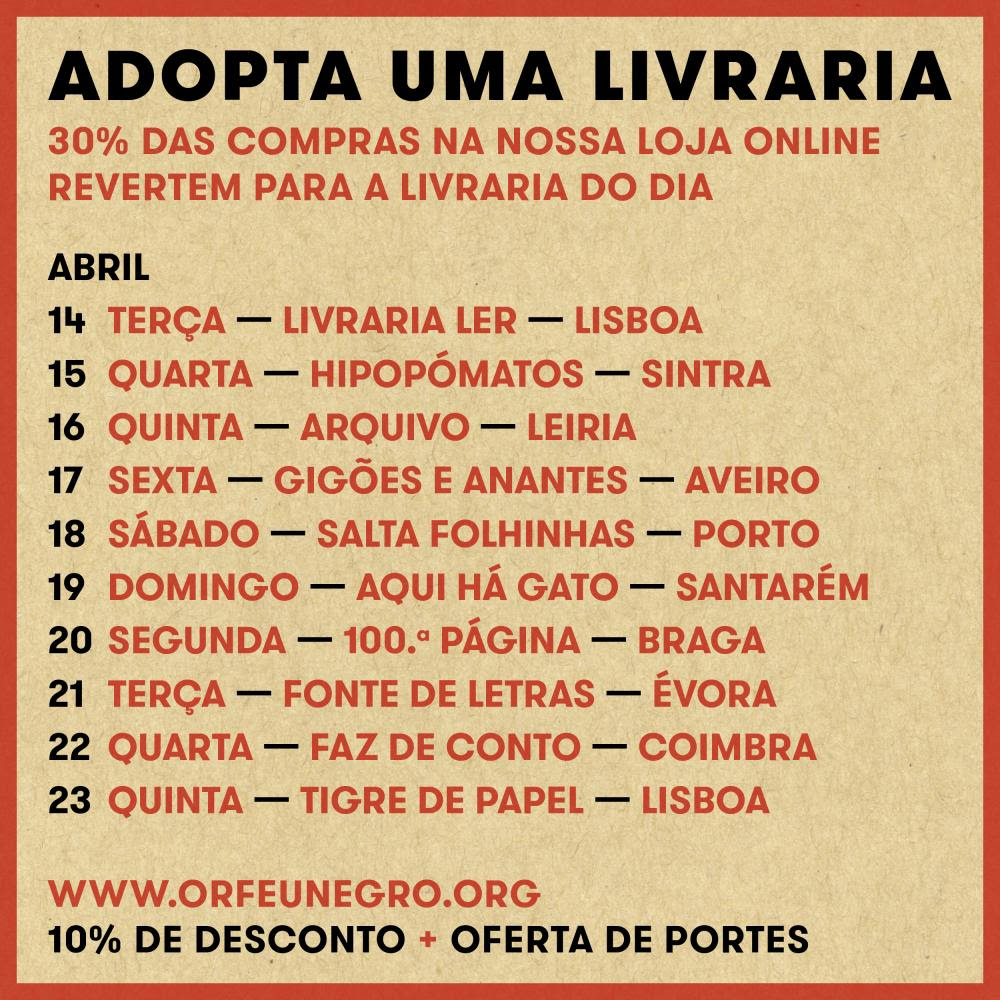 A lista completa das livrarias e dos dias da campanha pode ser consultada nas imagens abaixo e nos websites das editoras (www.orfeunegro.org e www.antigona.pt) a partir de segunda-feira, 13 de Abril. “A iniciativa Adopta uma Livraria constitui um pequeno gesto de resistência, que sabemos à partida insuficiente e ao qual contamos somar mais nos próximos meses. Esperamos também que outras editoras se juntem com acções semelhantes”, terminam, em comunicado.