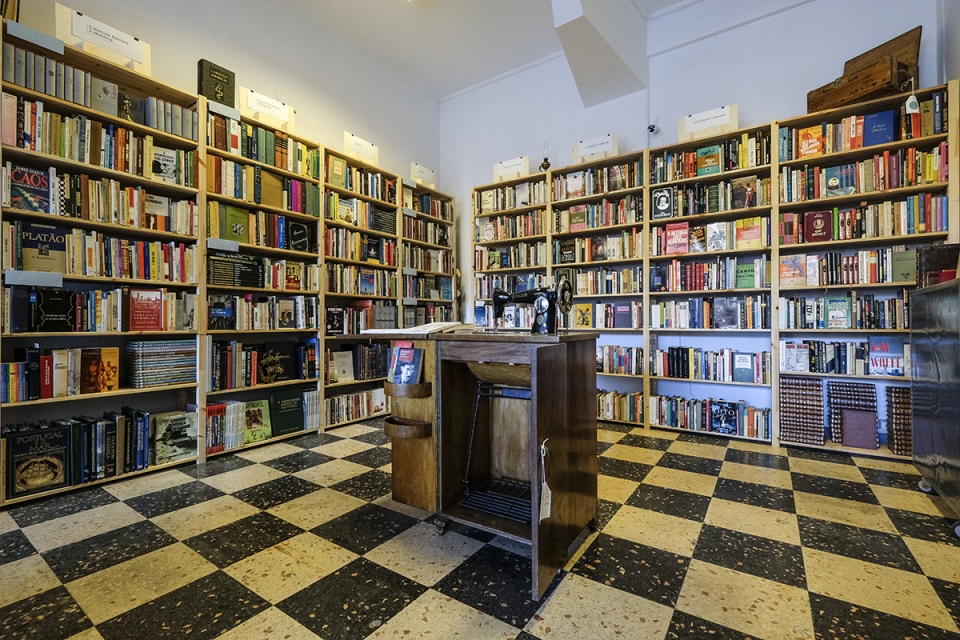 Luminosa e decorada com algumas antiguidades, a livraria é um espaço fotogénico. Tem um mosaico de livros velhos na parede e uma televisão a preto e branco em frente a duas poltronas que convidam à leitura, porque também quer ser um local para se estar. Já os três mil livros à venda na loja distribuem-se por várias estantes/secções: livros antigos e raros; arte, design e fotografia; literatura portuguesa e estrangeira; banda desenhada e infanto-juvenil; literatura lusófona e traduzida; ficção; livros técnicos e práticos; ciências sociais; história; textos políticos.