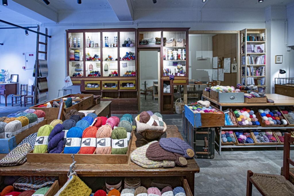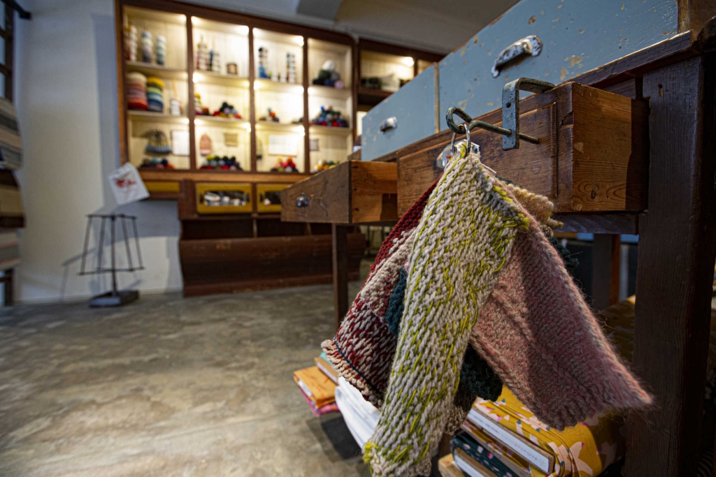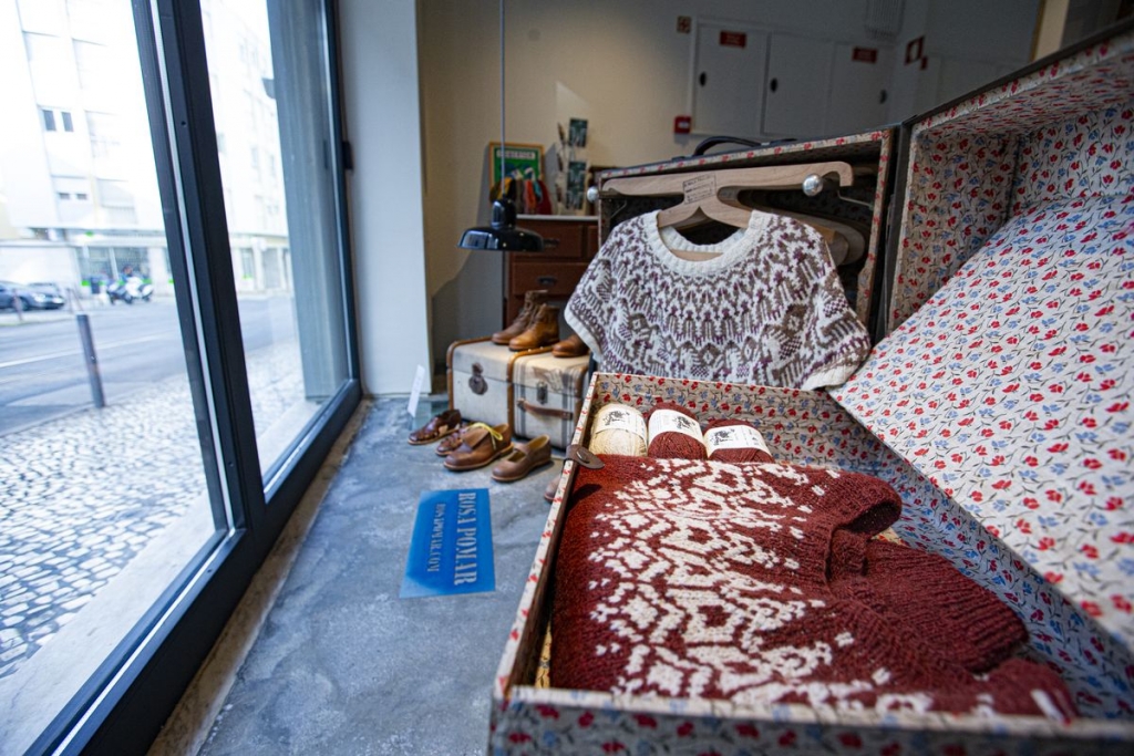 Na montra há também sapatos e botas de cabedal de modelos intemporais (um deles, português, da Primeira Guerra Mundial). Já numa lateral abre-se a sala destinada aos workshops, cujo calendário é anunciado no website e nas redes sociais. Quem quiser afinar a arte das agulhas ou iniciar-se, pode comprar um emblema ou um kit completo para tricotar um gorro em casa, cujas receitas revertem para a associação de produtores de ovelha churra mondegueira.