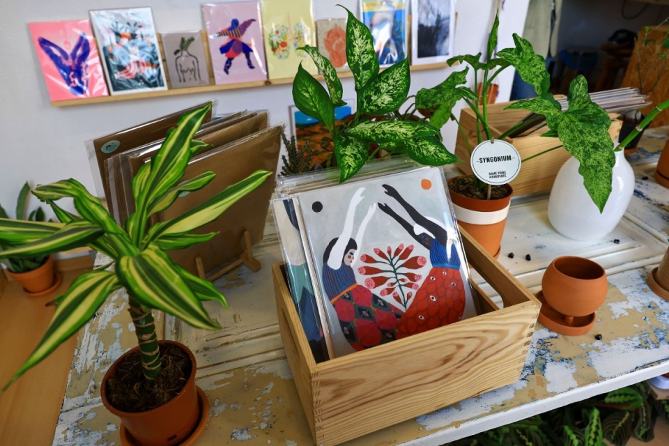 A Phloemii vende flores preservadas e plantas de interior como suculentas, catos, marantas, calatheas e monsteras – “quase todas de fácil manutenção” -, ilustrações, livros e macramés. Há livros de mesa sobre plantas e jardins e as cerâmicas são feitas à mão por vários artistas e por um jovem oleiro de São Pedro do Corval, no Alentejo, já com um toque moderno. “O objetivo da loja é levar a botânica e a natureza para dentro das nossas casas”, contextualiza a jovem.
