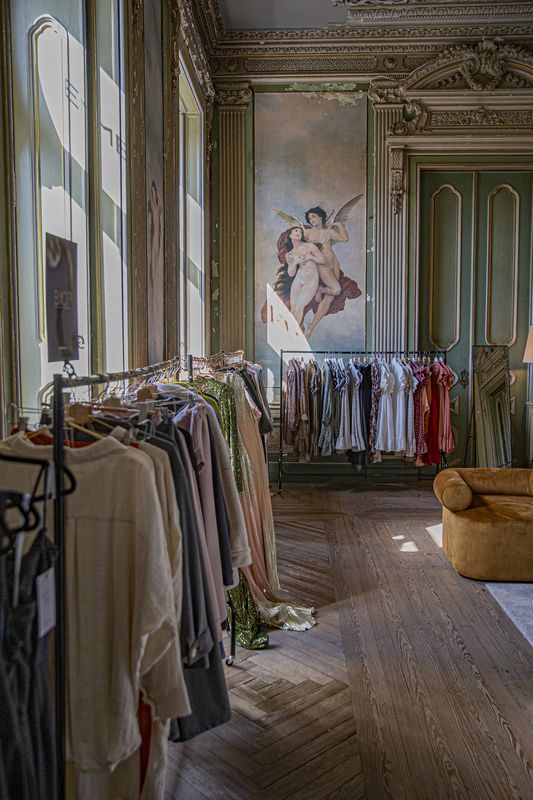 É numa das salas do palacete neoárabe Ribeiro da Cunha, do século XIX, que acolhe o espaço multicultural Embaixada, que Fernanda Velez, empresária e influenciadora, abriu a sua primeira loja, há dois meses. Num ambiente elegante, entre frescos, tetos trabalhados, cortinas de provadores em veludo e cabides em tons dourado que se vende roupa feminina de 12 marcas, todas nacionais à exceção de uma espanhola.