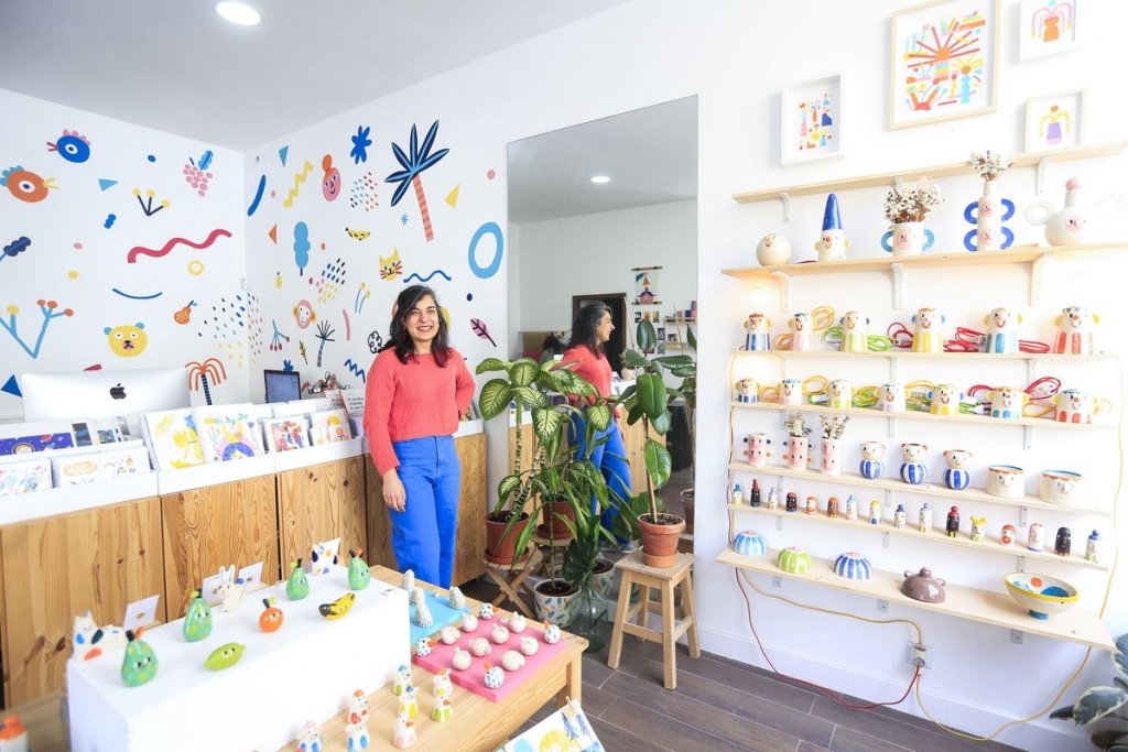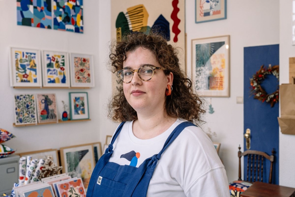 Quase ao lado, fica outra oficina e loja de ilustração bem colorida, desta feita, de Ana Seixas. “As pessoas param no semáforo e ficam a ver a montra”, comenta, sorridente, deitando um olhar à rua. A criadora estudou design gráfico e depois fez uma pós-graduação, em ilustração infantil, muito virada para a parte editorial. Desejosa de aplicar a ilustração a produtos e contactar diretamente com o público, quis ir além dos livros e revistas. Começou a vender ilustrações em feiras e montou uma loja online, que acabou por ganhar existência física.