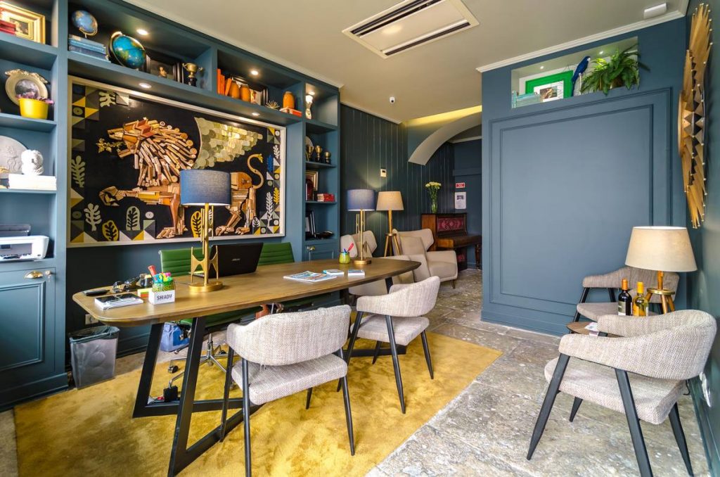 Foi a história do Palacete dos Leões Dourados que inspirou Gezo Marques e José Aparício Gonçalves – da muito conhecida Oficina Marques – no projeto de design de interiores da Quinta Colina, a mais recente guesthouse do Grupo Shiadu (que já tem sete deste género espalhadas por Lisboa e Porto). Quem dá as boas-vindas aos hóspedes, depois dos simpáticos membros do staff, é um leão alado feito com peças de madeira e outros materiais.