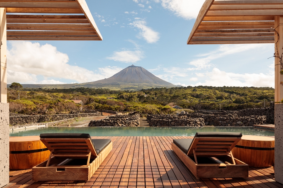 A imagem onde cabe o vulcão, que parece emergir de um manto verde, e as vinhas, abraçadas pelos muros de pedra vulcânica que marcam a paisagem picarota, são presença quase constante – e sempre arrebatadora – na Adega do Fogo, uma “casa de férias de luxo”, no norte da ilha.