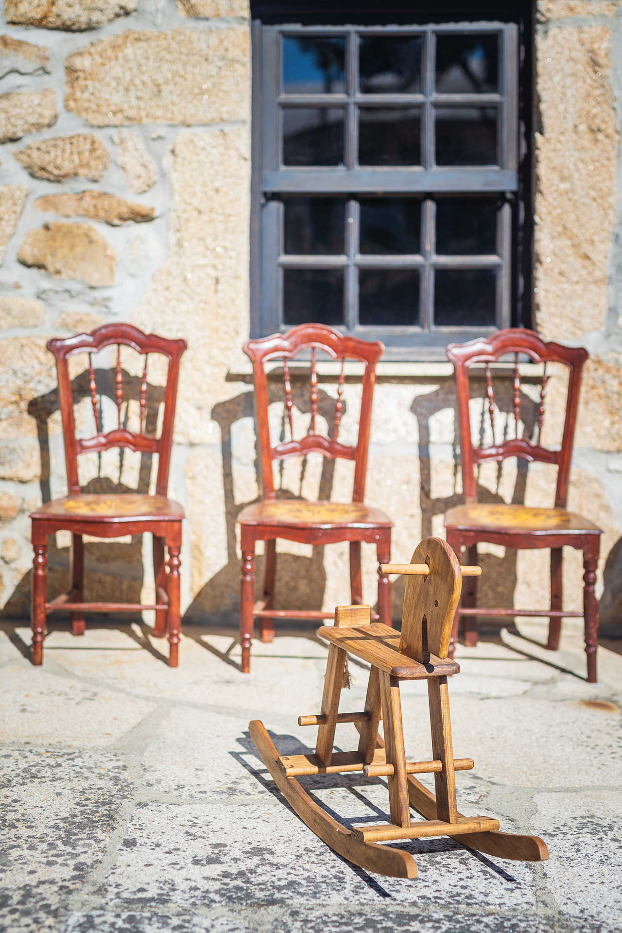 Numa das paredes, dá-se a conhecer três gerações daquela família. A começar pela bisavó Maria José, emigrante no Brasil e cuja arca que levou na viagem está entre as peças de decoração da casa, assim como a antiga secretária em madeira, onde António se debruçou nos seus tempos de estudante. Mas há mais o que faça voltar no tempo: os azulejos, o ranger do soalho, as maçãs a amadurecer num parapeito, a lareira em pedra, a antiga eira e o espigueiro no exterior, e até as janelas, que exigem força de braços para subirem, mas que também fazem parte do encanto.