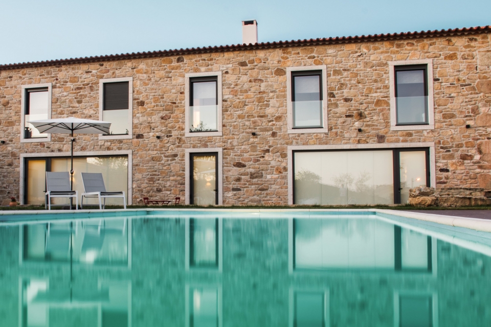 “Tentámos trazer um bocadinho daquilo que já existia na casa ou na região e dar-lhe alguma modernidade, sem ser demasiado. Queríamos transmitir todo este sossego que se vive aqui à volta”, explica Ana. “O tempo passa num ritmo um bocadinho diferente aqui na aldeia, e queremos que as pessoas venham e vivam sem pressas. Por isso, a principal atividade que promovemos é o ‘fazer nada’, é mesmo para desligar, para aproveitar a piscina, o pequeno-almoço com produtos da região e com as compotas da minha mãe e os morangos da horta”, recomenda. Irene e Francisco, os pais de Ana, vivem numa parte privada da casa, e são quem recebe os visitantes.