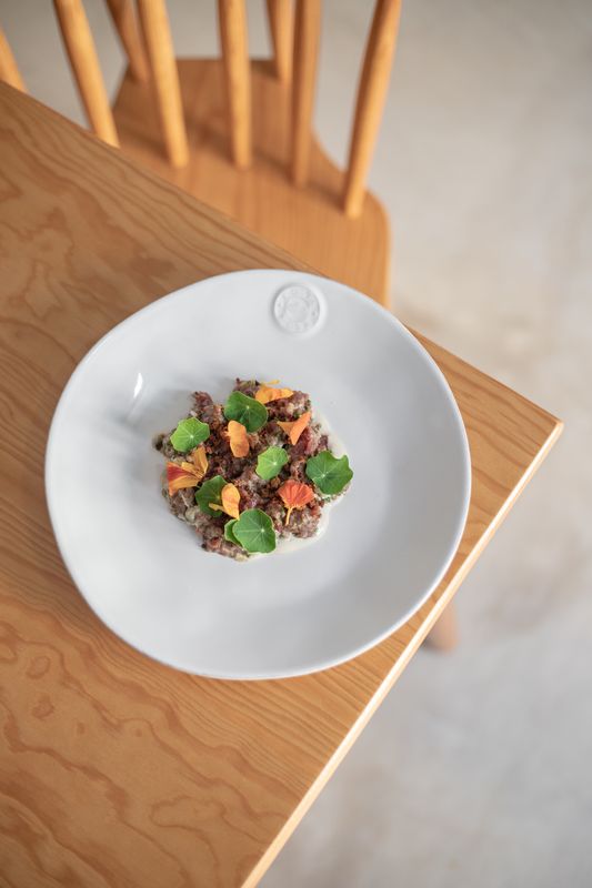 Sem distinguir entradas de pratos principais e apelando à partilha como nas tradicionais mesas alentejanas, o chef acena com tártaro de atum com emulsão de ostra e muxama de atum; ovos de codorniz com gamba da costa e caviar; beringela com mel e especiarias, chimichurri, molho de iogurte e cajú; e pescada de anzol com lingueirão à Bulhão Pato e acelgas, entre outros. Há uma aposta nos vegetais e no peixe e o cuidado de o pão do couvert ser feito na casa, assume o chef, que é coadjuvado por Francisca Dias, sagrada finalista no concurso Chefe do Ano 2024.