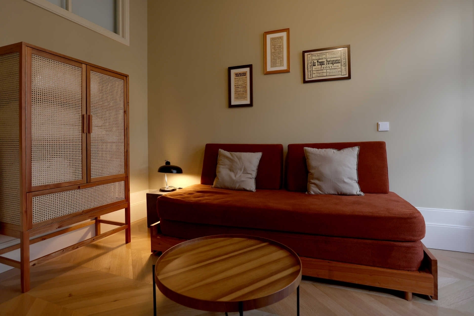 À entrada, num pequeno lobby junto à escadaria central, um retrato de Moura Coutinho e o projeto original do edifício, emoldurados na parede, lançam o tom de homenagem que ecoa por todo o Villa Theatro. O edifício foi projetado em 1922 pelo célebre arquiteto que assinou muitas outras obras emblemáticas na cidade, como a fachada da Igreja do Carmo e do Café A Brasileira, ou o vizinho Theatro Circo – duas portas abaixo, na Avenida da Liberdade -, a cuja proximidade se deve o nome do alojamento. Volvidos 100 anos, o prédio histórico renasceu como guesthouse de charme, fruto de um intenso trabalho de reabilitação que durou três anos.