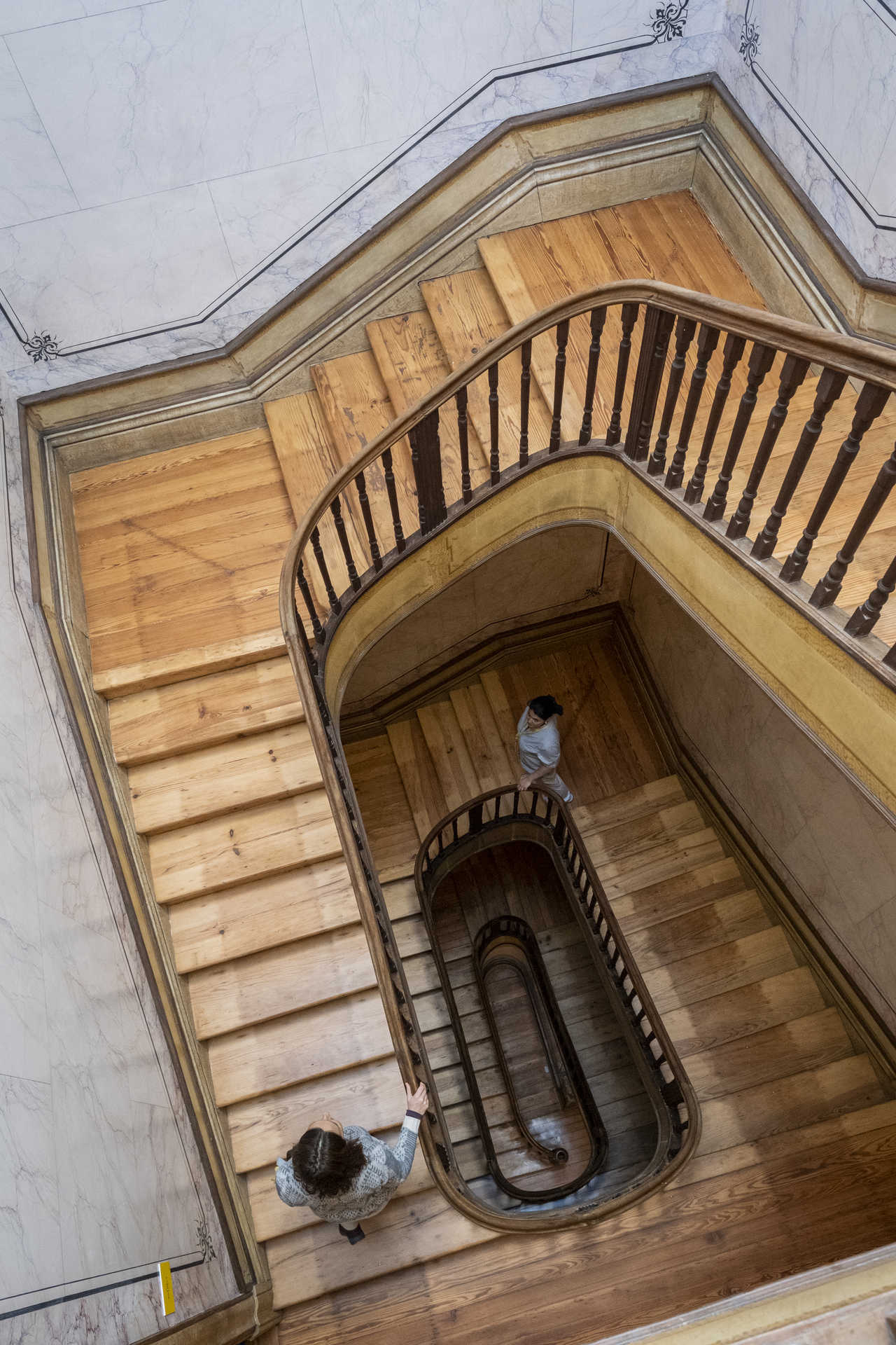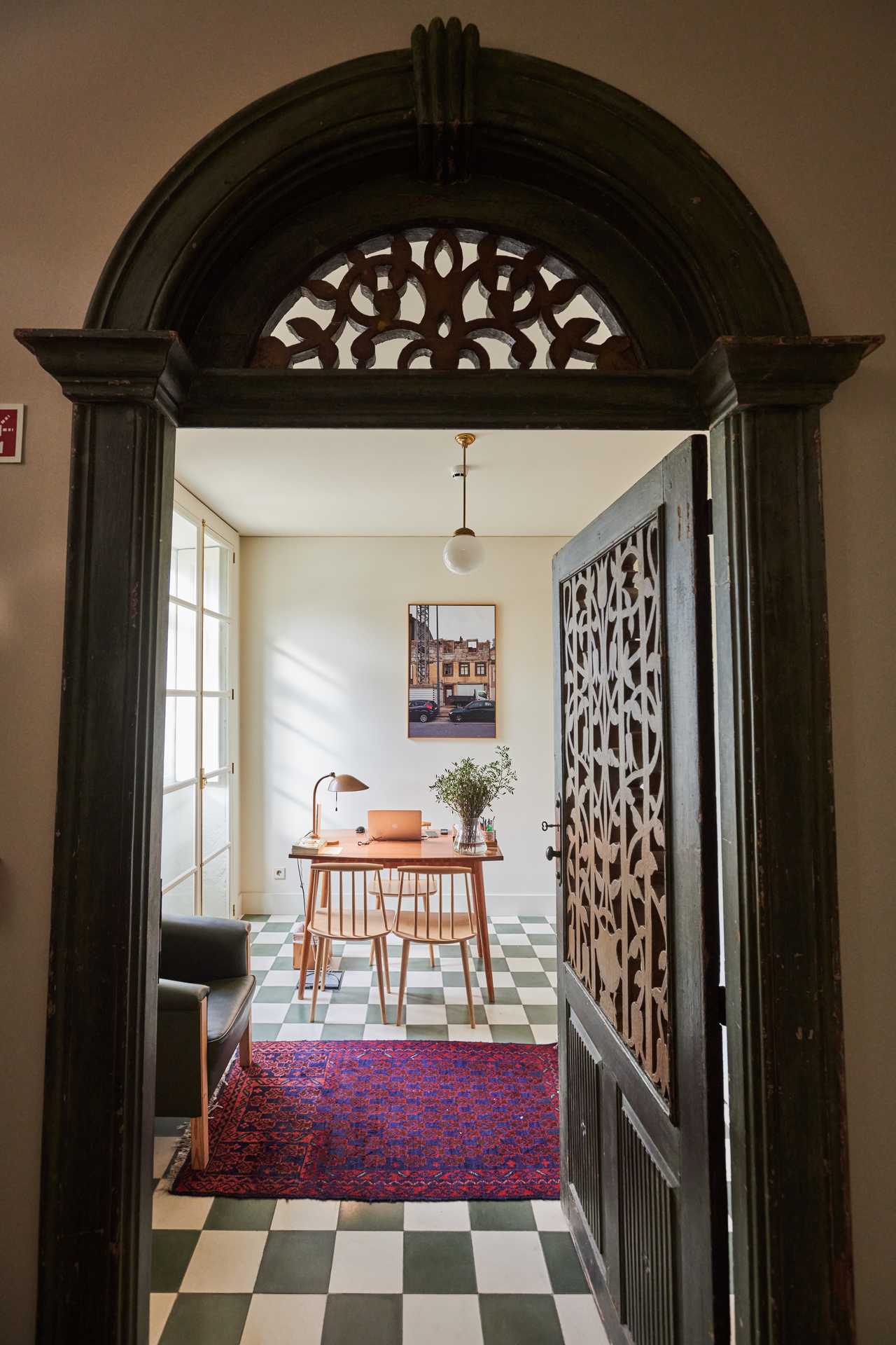Desde o início das obras de restauro, em 2017, a intenção dos quatro proprietários foi conservar ao máximo as características originais da casa. Por isso, o soalho marcado pelo longo tapete que em tempos o cobriu ainda range sob os passos de quem percorre o corredor e a escadaria. Mantêm-se as paredes pintadas a imitar mármore, os exuberantes estuques, as portas, as cores e até alguns dos móveis e louças originais das casas de banho.