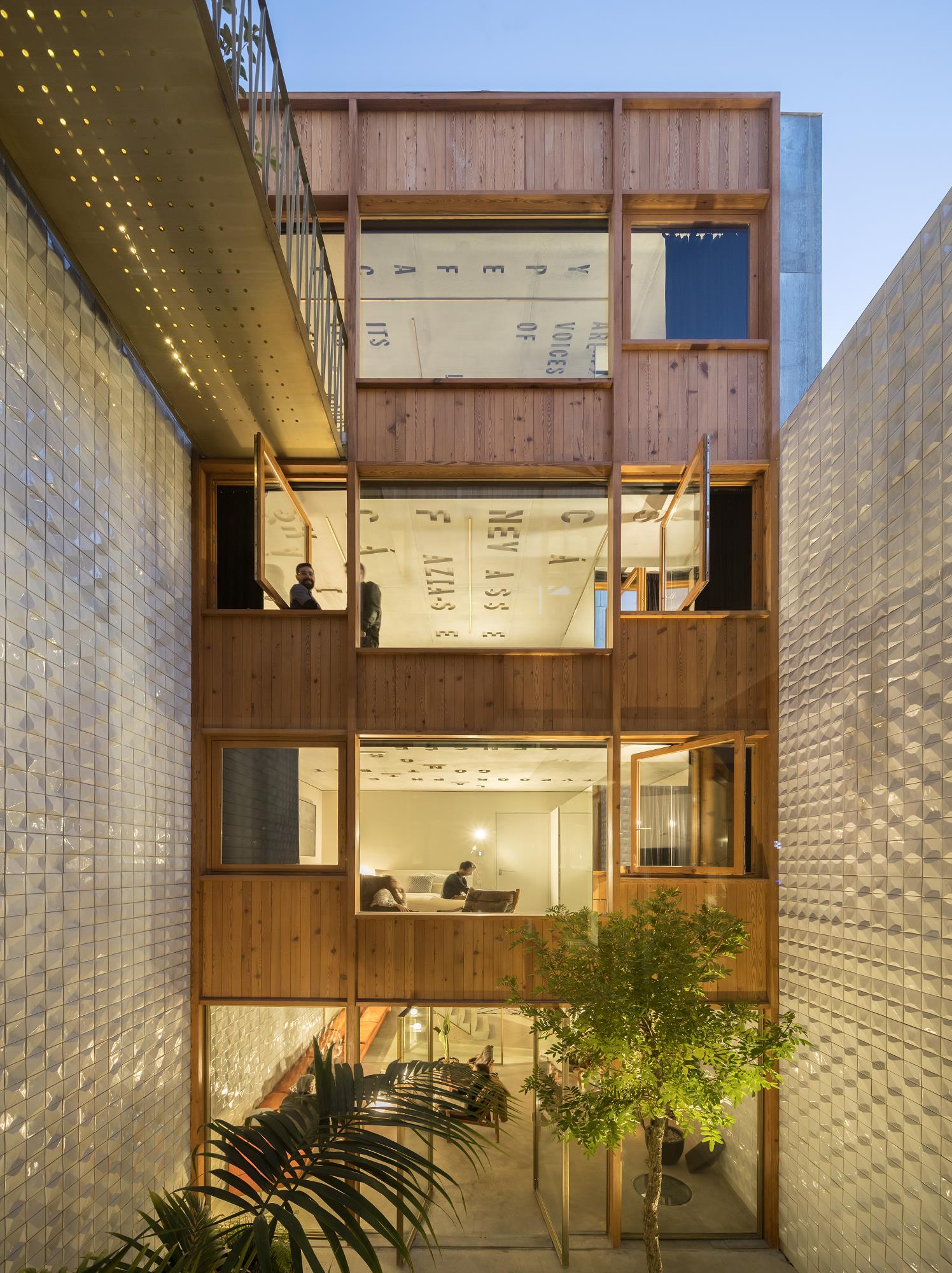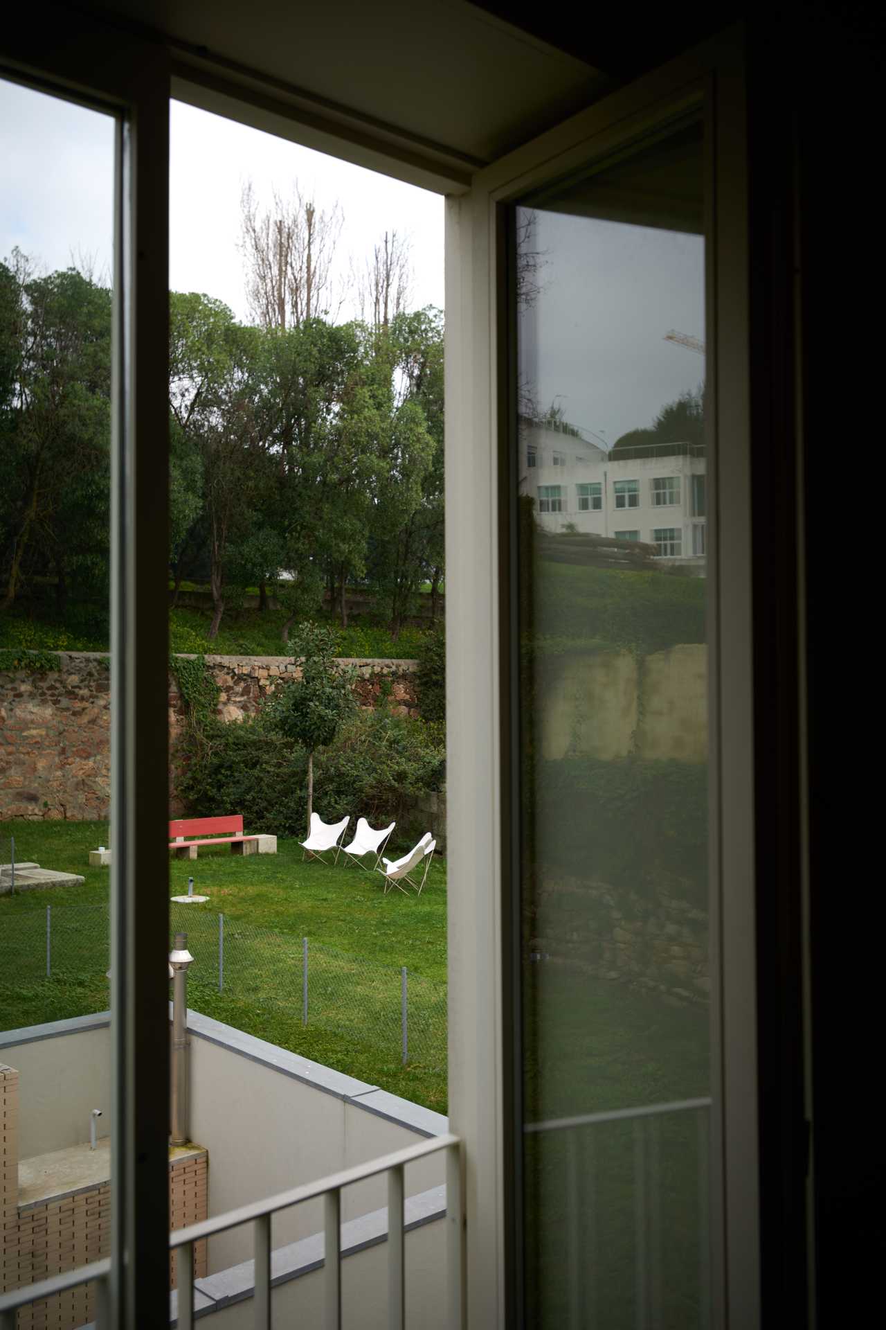 Alguns dos quartos têm vista para a rua e outros para o jardim das traseiras ou para o tal pátio, um elemento central, que privilegia as zonas comuns. Uma delas, o Café Cultural, que serve de apoio ao hotel, recebe na primeira quinta de cada mês o Multiverso, um ciclo de música, teatro e cinema, aberto à cidade e com eventos agendados até agosto. Uma das zonas mais surpreendentes da Tipografia do Conto é o jardim das traseiras, onde um generoso tanque, aumentado com o reaproveitamento do granito que saiu da obra, convida a mergulhos em dias mais quentes. Ana Luísa Santos