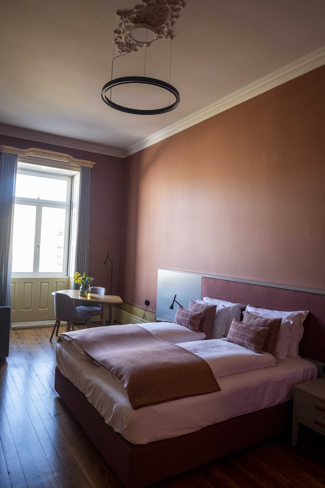 O que Luísa Moura e a mãe, Luísa Penha, também arquiteta do Duas Portas, procuraram para todo o espaço foi “o equilíbrio entre o contemporâneo universal e a especificidade do Porto”. Daí que à brancura quase imaculada dos tetos, das paredes e da roupa de cama, se juntem elementos em dourado e em verde seco, uma cor “muito típica” da cidade, tal como o mosaico hidráulico e o soalho de riga.