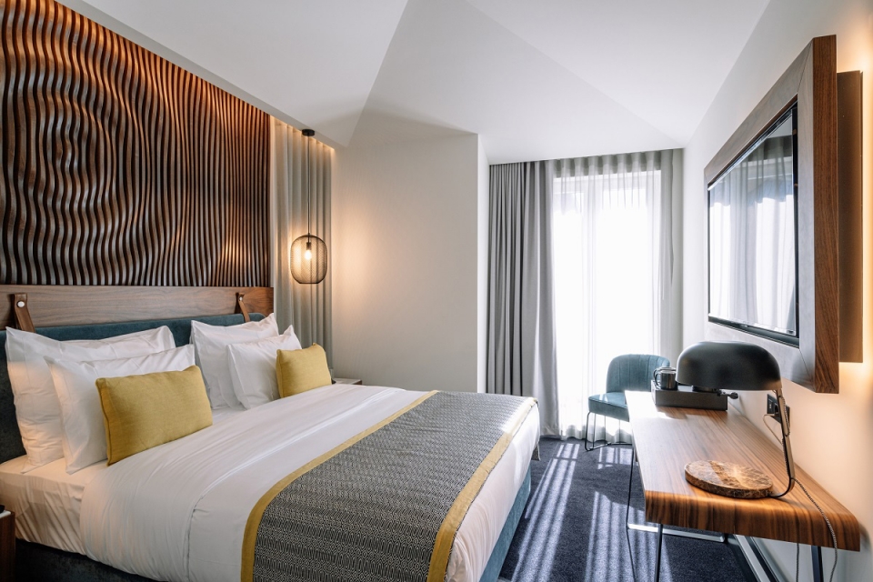 As duas salas de pequeno-almoço, forradas a pedra – com ligação ao pátio interior, que exibe um jardim vertical – têm ares de aconchego sem abdicar da elegância, algo comum aos diferentes espaços. A piscina interior, com água aquecida e uma pequena sauna, o ginásio e uma sala de reuniões ficam mais abaixo. E, em breve, haverá um restaurante de petiscos voltado para a rua: o P Gastro Bar.