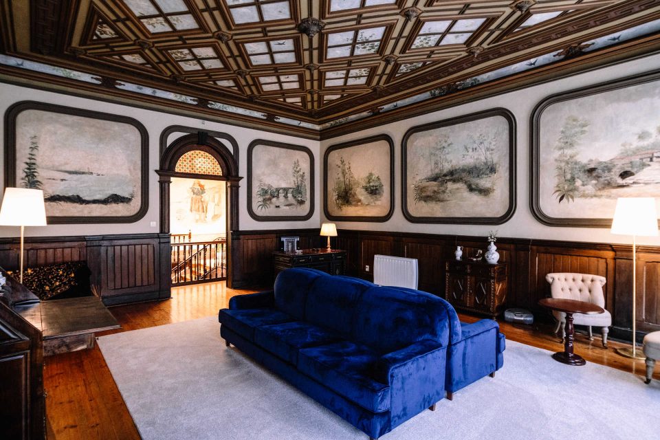 O palacete tem quatro suítes disponíveis para os hóspedes, todas elas decoradas à época, com pormenores encantadores. É o caso da suíte panorâmica, um duplex com biblioteca privada no andar inferior, onde antes funcionava a antiga cozinha da casa, e que guarda ainda traços peculiares, como um louceiro escondido e uma pequena casa de banho na varanda. No quarto sobressaem as vigas em madeira no teto, originais da casa, e a coluna da chaminé em relevo numa das paredes.