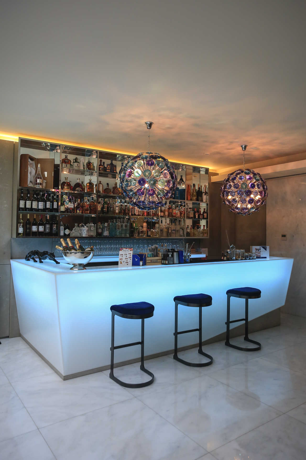 Por todo o 4615 Hotel sente-se um ambiente elegante e confortável, com muito branco, dado sobretudo pelo mármore Ibiza, dourado e azul-escuro, uma das cores da cidade. Esta paleta surge logo na entrada, onde está a biblioteca, o business center, com dois computadores, e um enorme televisor, e estende-se até ao bar, mais à frente, aberto ao público. Além de cocktails clássicos e de autor, gins, licores e infusões variadas, ali também se servem saladas, massas, hambúrgueres e um prego no pão que está a fazer sucesso entre os clientes.