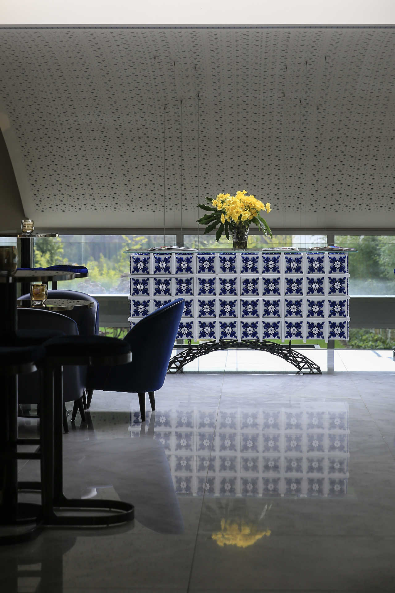 o aparador Arc, do designer Marco Sousa, é um dos elementos mais marcantes do hotel, e esteve em exposição pelo mundo fora. Os azulejos azuis e brancos remetem para a cidade do Porto e a base de suporte é uma alusão à ponte D. Luís.