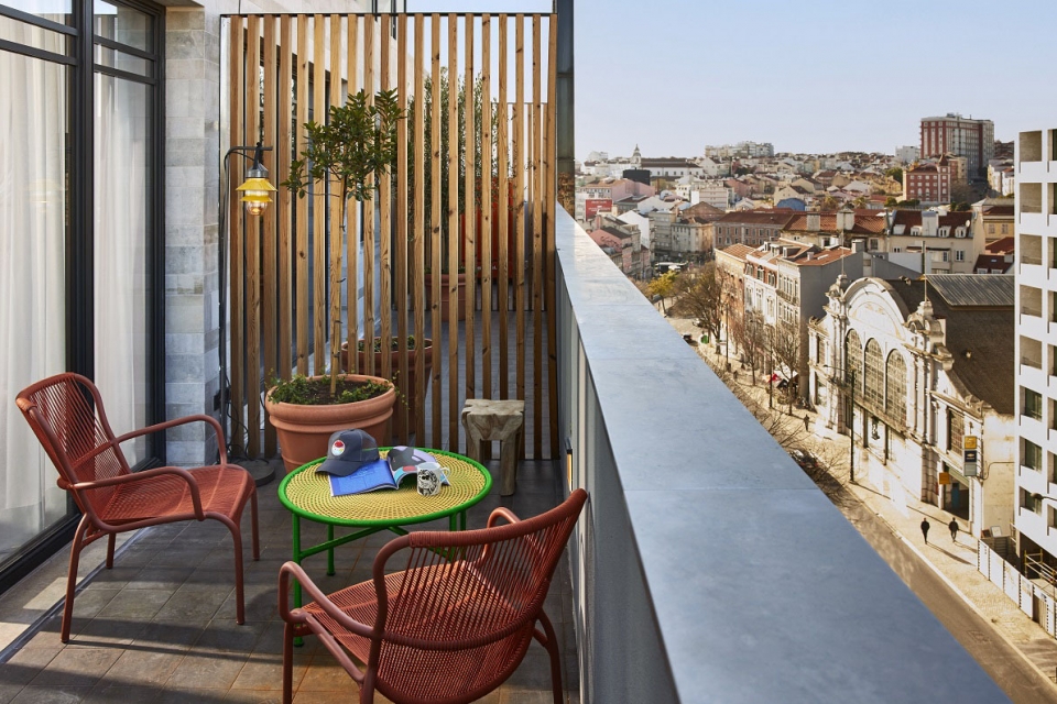 Nos quartos, dá-se ainda importância à reutilização, como mostram as mesas cuja base é feita de tampas coloridas de garrafas. Do conforto das camas ou das varandas de alguns dos quartos (duplos ou suites, até quatro pessoas), a vista vai variando, mas é possível, de alguns pontos, olhar para o Tejo, o Castelo de S. Jorge e os bairros alfacinhas em redor. A mesma panorâmica tem o rootfop que chega em abril, com bar e petiscos, e do qual se avista até a Serra da Arrábida.
