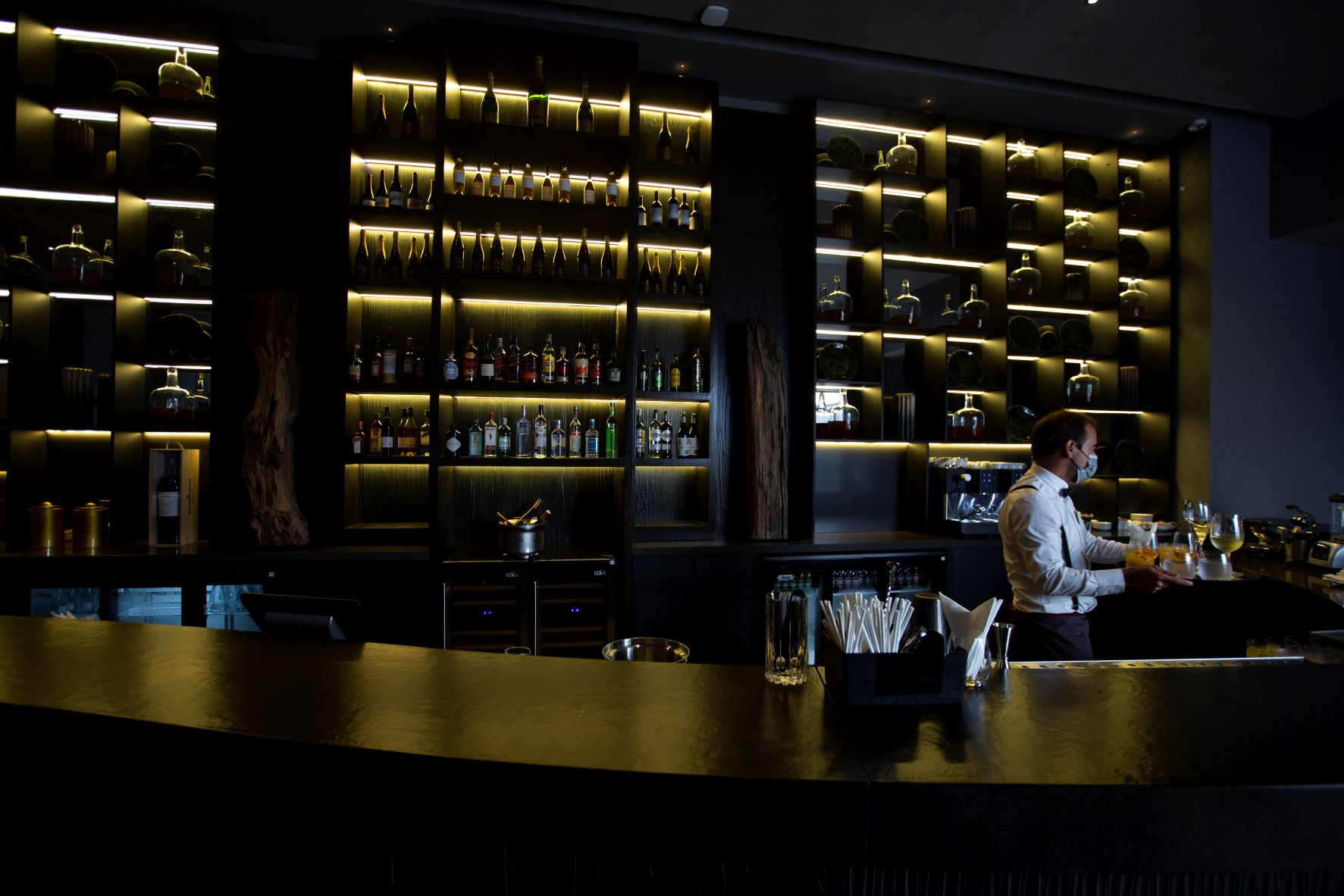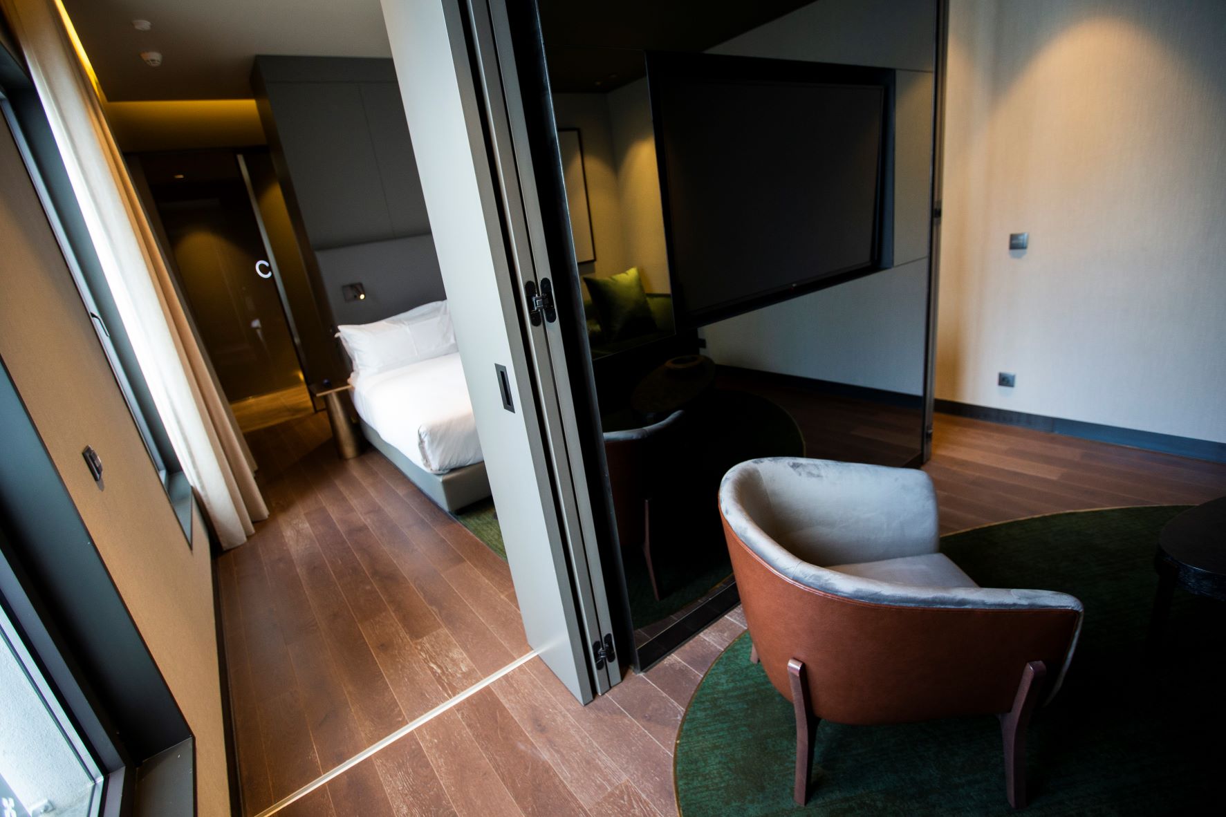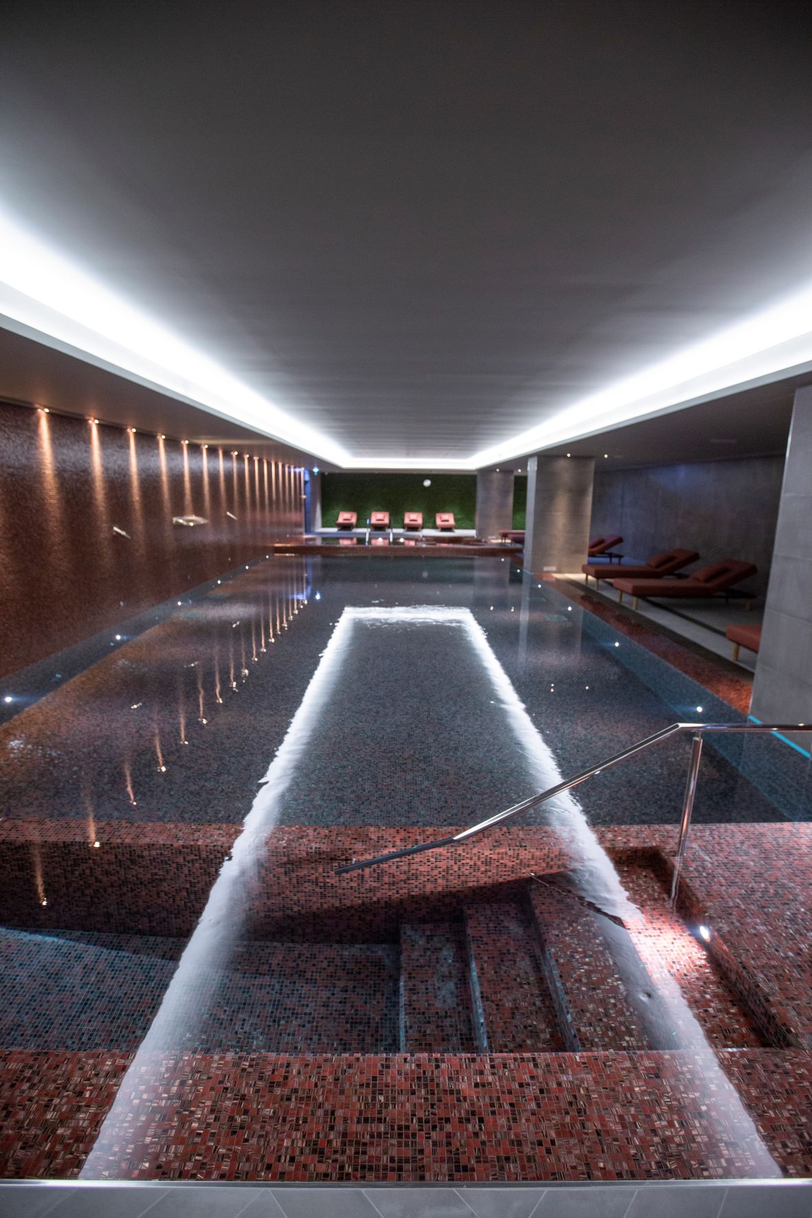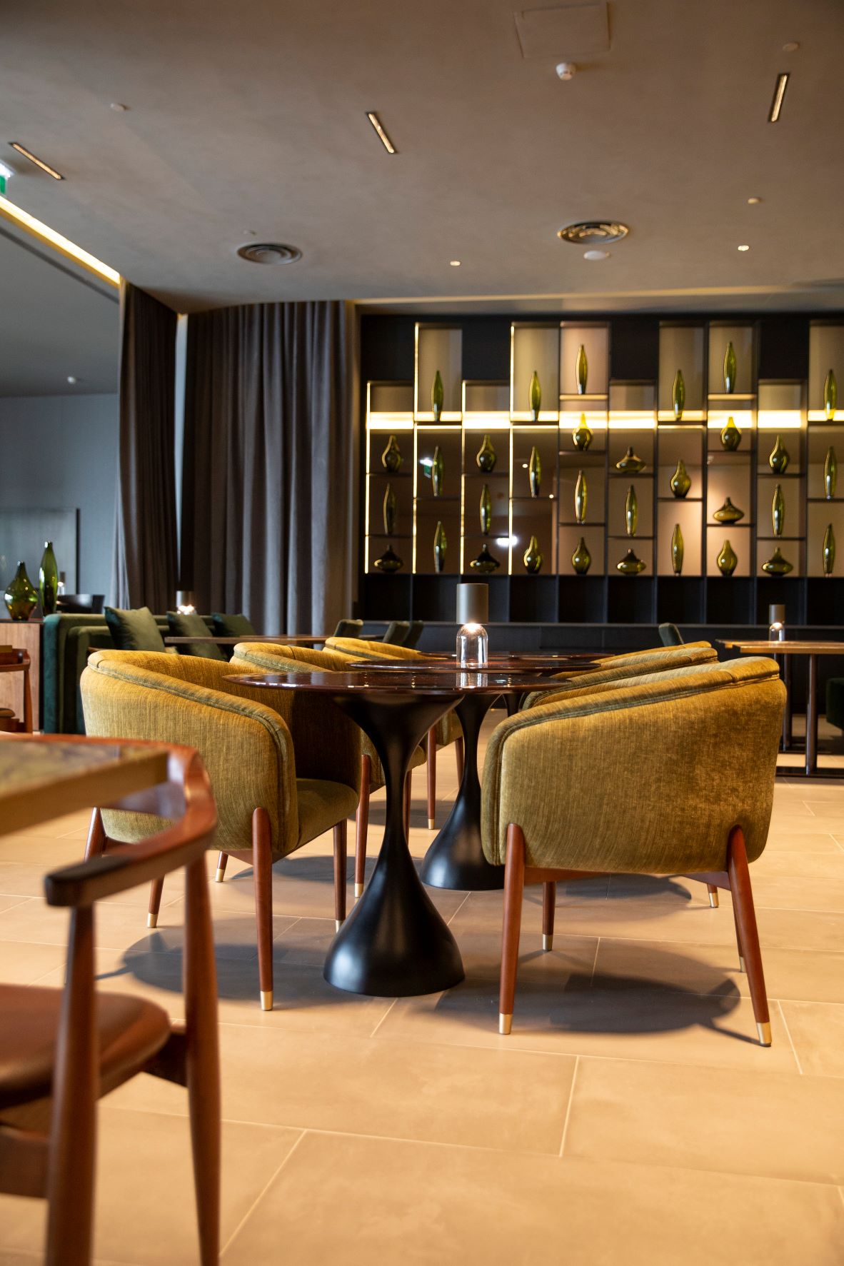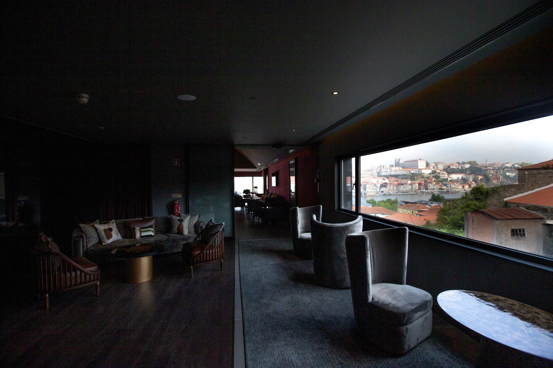 O feito de tornar sóbrio um edifício que ocupa 32 mil metros quadrados deve-se ao trabalho desenvolvido pelo ateliê de arquitetura ARQ 2525, liderado pelo arquiteto Miguel Miranda. Mas também à decoradora de interiores Nini Andrade da Silva, que apostou nos tons sóbrios e em objetos que remetem para o mundo natural, resultando num ambiente de “luxo contido”, que se revela à boleia de tons como o dourado, a remeter para o sol; o carmim, do vinho; os cinzentos, do nevoeiro e da Muralha Fernandina; o verde da Natureza; e o castanho, da madeira.
