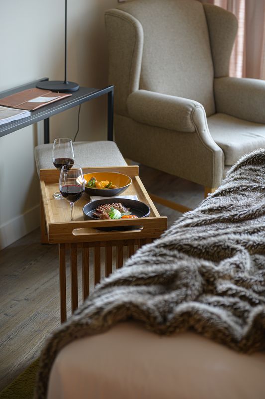 Tal como em Alfama, o projeto é do arquiteto Samuel Torres de Carvalho, que escolheu a madeira para revestir o interior, em harmonia com a pedra lioz. Na decoração das áreas comuns e dos 41 quartos sobressaem várias obras de arte, tapeçarias e detalhes de luxo como televisões Bang & Olufsen, amenities Hermès e lareiras nas varandas de algumas tipologias. Já o serviço que abre a cama à noite deixa a previsão da meteorologia e sugestões de agenda debaixo de um chapéu.