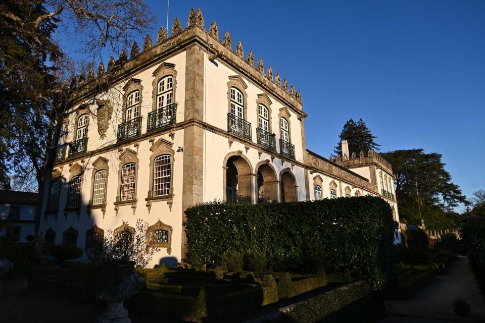 Entrar na Casa da Ínsua, em Penalva do Castelo, é mergulhar num mundo encantado, feito de árvores majestosas, jardins e aves cantantes, um corredor de buxos e lugares com nomes poéticos, como Tanque dos Jarros ou Cruzamento das Quatro Virtudes. Na receção, continua o deslumbramento com cada pormenor, da grande lareira ao teto, que parece de madeira, mas é de gesso moldado e pintado à mão. Gonçalo Alves, assistente de direção, faz de cicerone. Há muito para ver, e o menor elemento conta uma história.