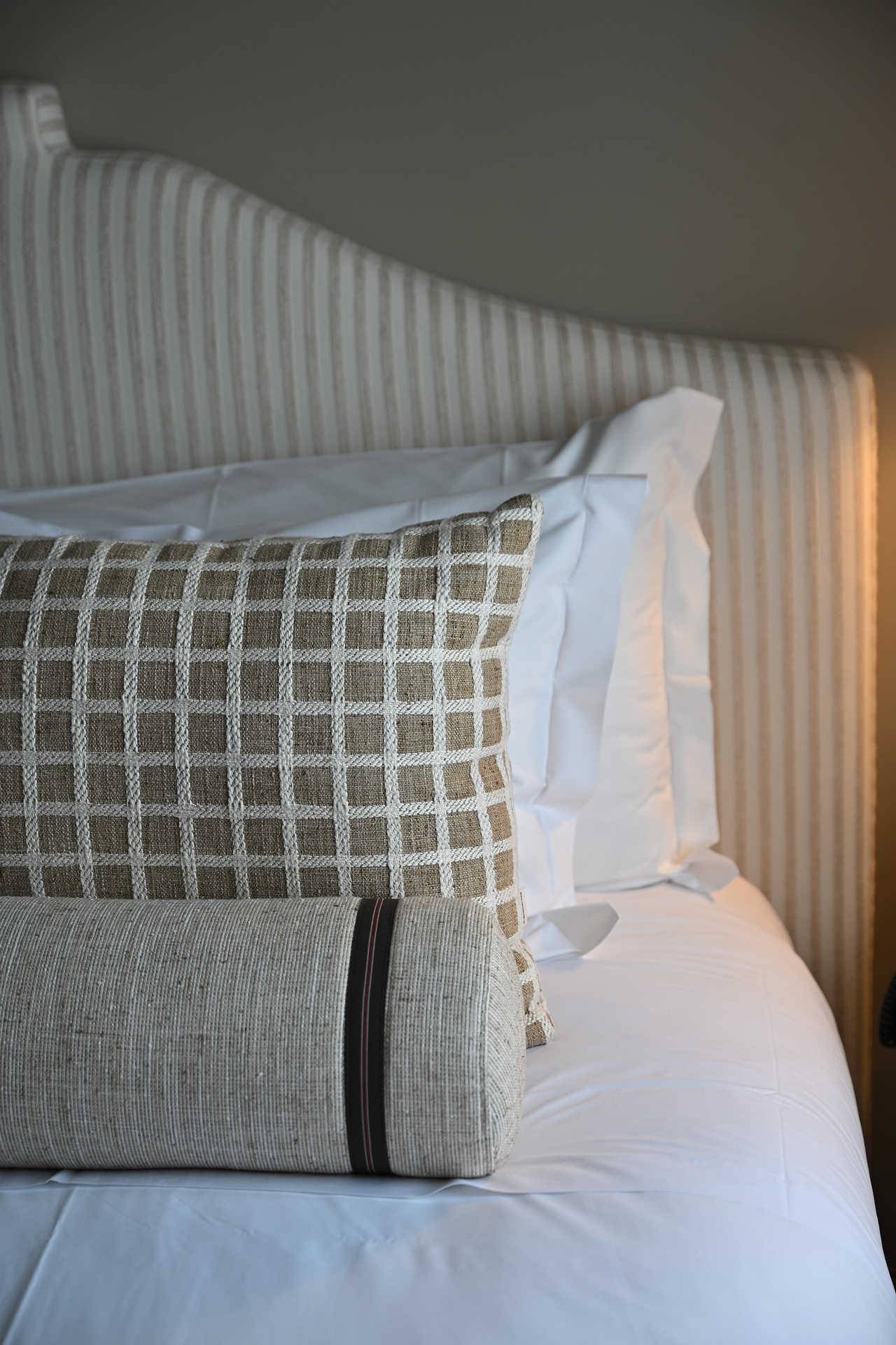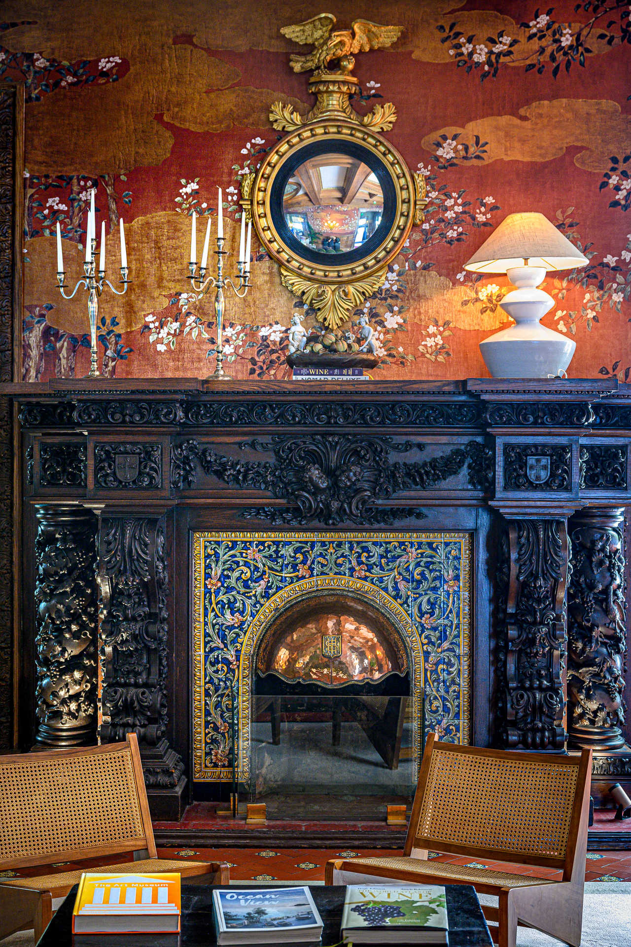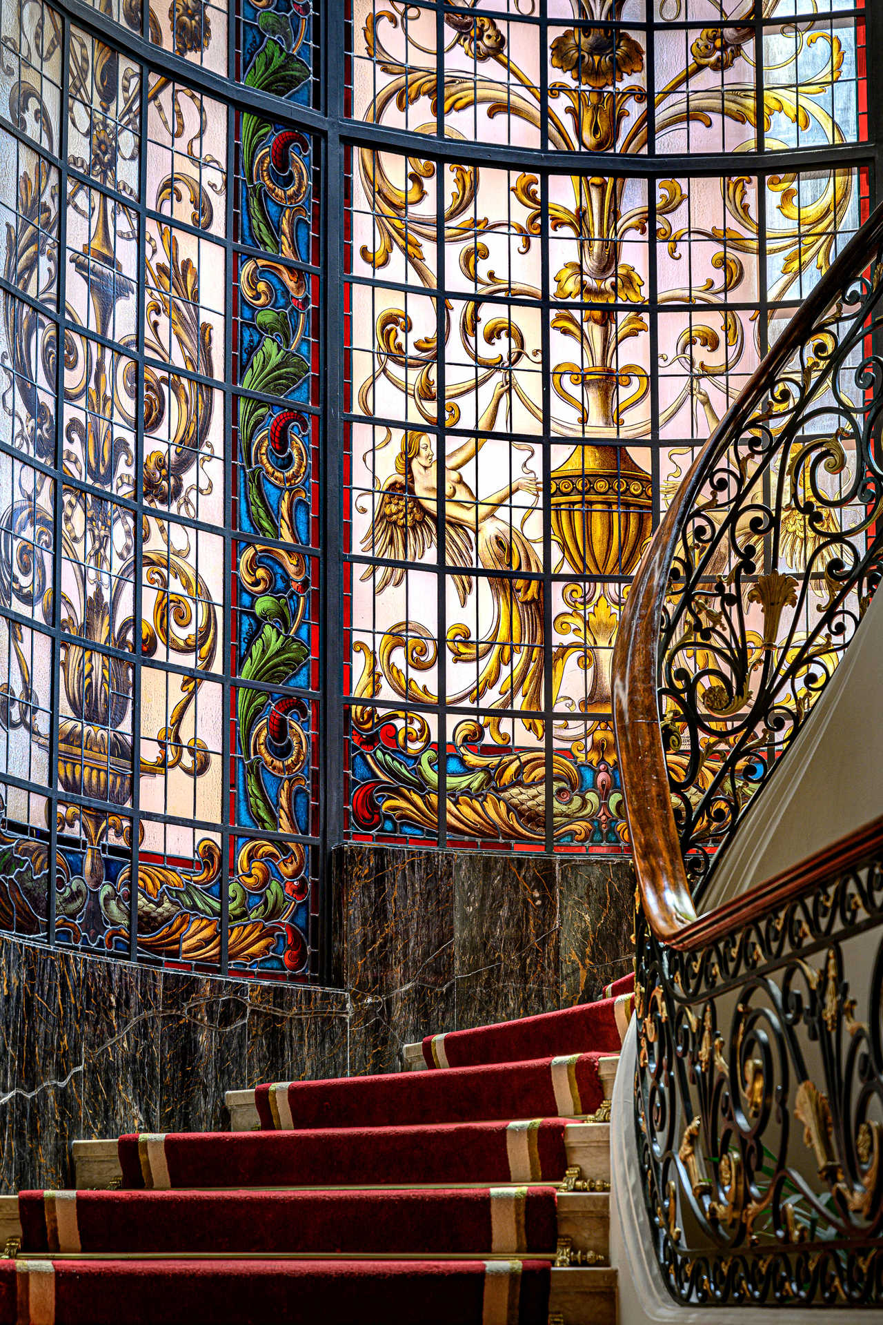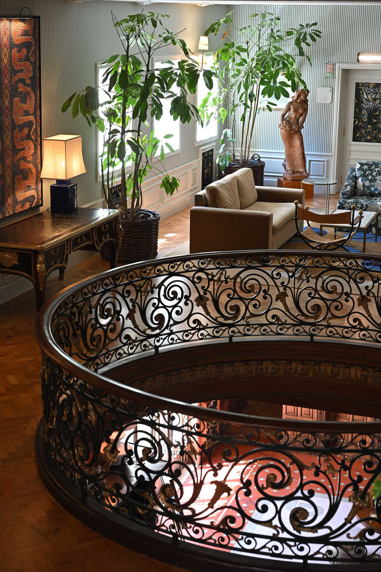 O objetivo foi enaltecer um edifício já bastante rico, que passou por diferentes fases e exibe múltiplos pontos de atração logo no átrio – da lareira aos caixotões do teto, passando pelo papel de parede, que é novo, ao contrário do pavimento, preservado com as naturais marcas do tempo. “Cada detalhe mais imperfeito é propositado, não quisemos camuflá-lo – faz parte da história do hotel”, aponta a designer de interiores, convidando a subir os degraus que acompanham os célebres vitrais do ateliê de Ricardo Leone, amplamente fotografados (também vale a pena usar o charmoso elevador, com banco).