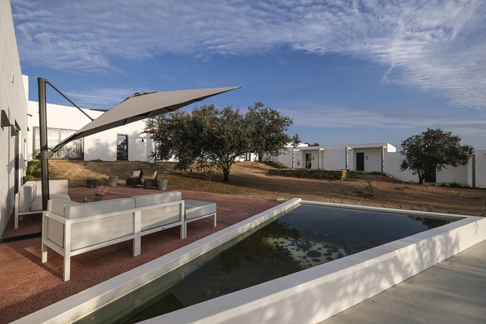 Desenhado pelo arquiteto João Barreto aproveitando o que restava de uma antiga casa agrícola, o edifício térreo espraia-se ao comprido acompanhando o declive do terreno. É como se uma linha reta invisível unisse a azinheira Geralda, ali há mais de 150 anos, numa ponta; e o Castelo de Monsaraz, na outra. A partir dela estendem-se as duas grandes alas com 11 suítes e duas casas T1 e T2. No núcleo comum funcionam a receção, o restaurante de cozinha alentejana Skyscape (que de momento só entrega as refeições nos quartos) e salas de estar com lareiras, biblioteca e um “bar honesto”.