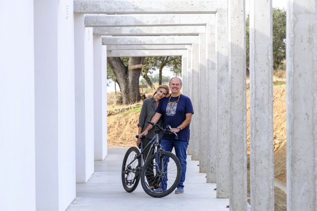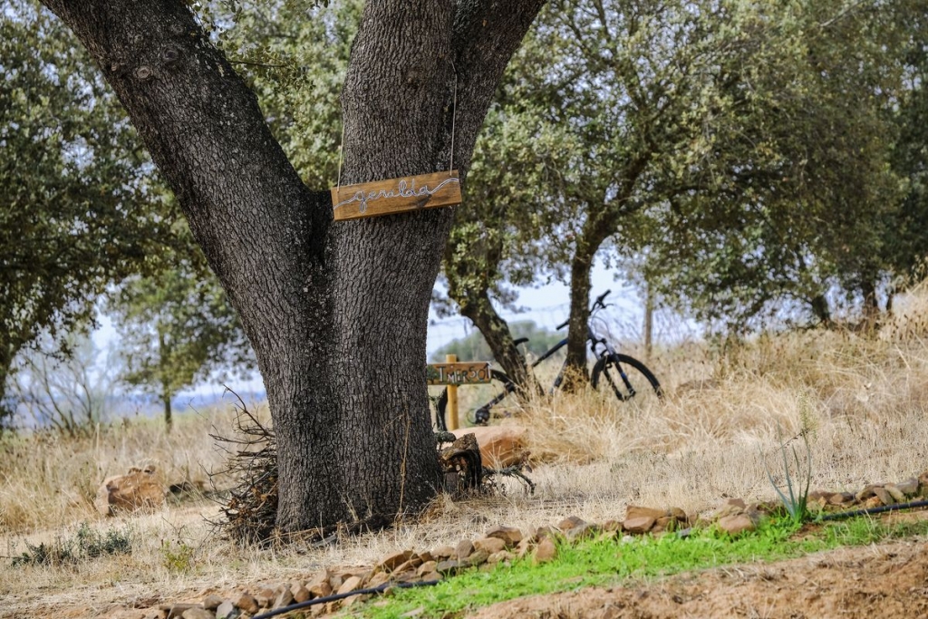 Desenhado pelo arquiteto João Barreto aproveitando o que restava de uma antiga casa agrícola, o edifício térreo espraia-se ao comprido acompanhando o declive do terreno. É como se uma linha reta invisível unisse a azinheira Geralda, ali há mais de 150 anos, numa ponta; e o Castelo de Monsaraz, na outra. A partir dela estendem-se as duas grandes alas com 11 suítes e duas casas T1 e T2. No núcleo comum funcionam a receção, o restaurante de cozinha alentejana Skyscape (que de momento só entrega as refeições nos quartos) e salas de estar com lareiras, biblioteca e um “bar honesto”.