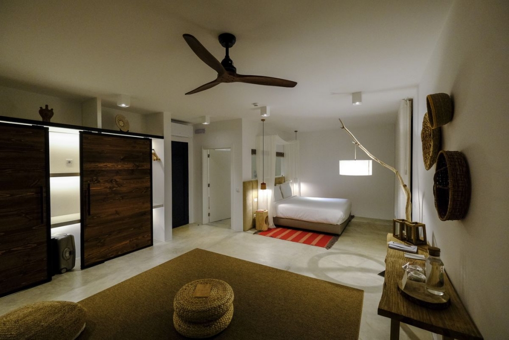 Foi tudo pensado para proporcionar um ambiente de descanso: as paredes brancas para o olhar descansar dos estímulos visuais constantes; as cadeiras de baloiço para deixar o corpo relaxar; e os terraços-alpendre de cada suíte, quatro deles com pequenas piscinas, para assegurar privacidade e conforto. O interior das suítes é minimalista e ganha cor com tapetes e peças de artesanato em vime e em cortiça. No fundo, são quase pequenas “casinhas alentejanas”, como Catarina gosta de lhes chamar.
