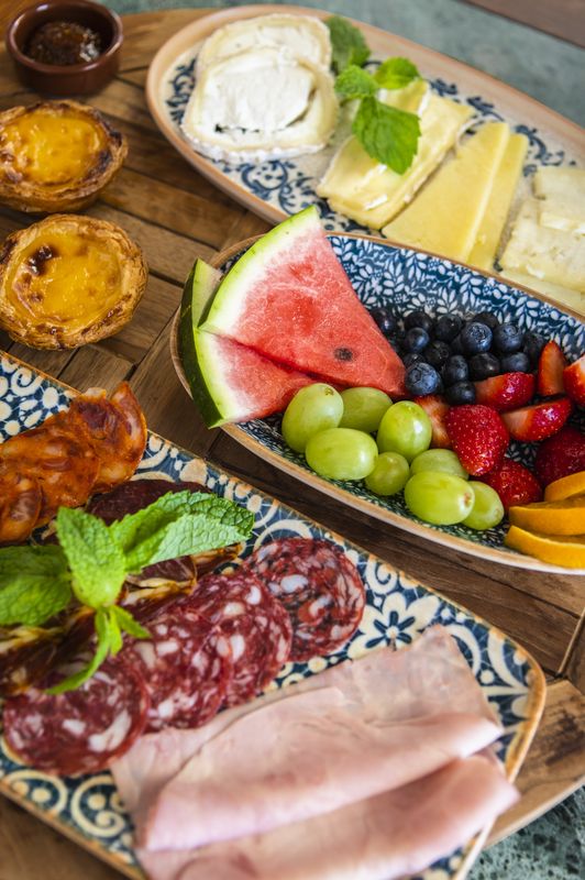 Por agora, o Vila Origens Boutique Hotel funciona apenas em regime de alojamento e pequeno-almoço, mas em breve deverá começar a servir jantares temáticos semanais. A refeição matinal, servida na esplanada em frente à piscina, surge numa tábua recheada com frutas, pães, queijos, charcutaria e pastéis de nata – e inclui detalhes de luxo como flutes de Moët & Chandon, para começar o dia em grande.