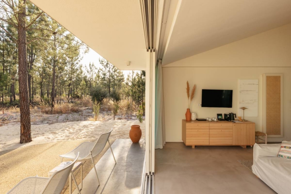 Uma lareira com design moderno desce do teto em madeira de pinho, perto da zona de sofás e cadeiras, para aquecer os hóspedes do Spatia Comporta, nos dias frios. Este espaço tem o ambiente de uma sala de estar, mas quando Tiago Rodrigues e João Vilela ali chegaram, depararam-se com uma decoração “estandardizada e com pouca alma”. Havia que a humanizar, dizem, e tirar partido da natureza envolvente: um oceano de pinheiros e oliveiras, estas mais de uma centena, que preenche de verde a propriedade com cerca de 100 hectares.