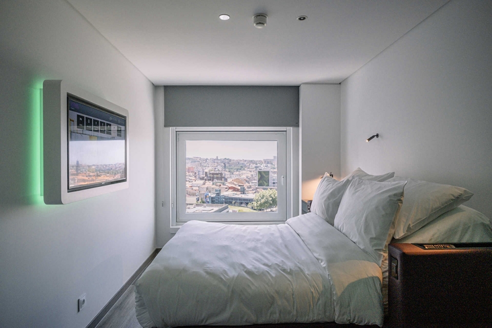 Cada canto é bem aproveitado, como se percebe pelo modo como se encaixa numa fresta a tábua de engomar (considerada essencial, assim como o ferro). Os quartos mais pequenos estão equipados com “smart beds”, camas que esticam e escolhem, permitindo otimizar o espaço, têm ligações USB dos dois lados e espaço para a bagagem em baixo. Há candeeiros que incluem carregadores sem fios, televisões SMART HD com Chromecast e luzes que mudam de cor, permitindo recriar diferentes ambientes. E graças à app, o hóspede nem precisa de se levantar.
