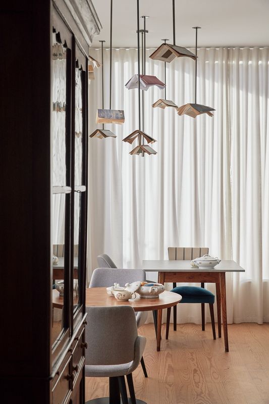 O alojamento foi desenhado pelo arquiteto António Castello Branco com inspiração nos chalés nórdicos, em madeira e com telhados bicudos. Felizmente, o clima da zona, apesar de temperamental, é mais ameno e a própria casa adapta-se a ele, com várias zonas de estar exteriores e interiores. O projeto coube à Fusion Interior Design, mas teve muito a mão da proprietária, que cedeu móveis e objetos como antiguidades, peças de arte e livros. Estes são às dezenas, senão mais, e encontram-se em cada recanto, desde a grande e luminosa sala do piso inferior às estantes de vários móveis, degraus das escadas e suspensos no teto da sala de refeições. Folhas e piteiras secas decoram as paredes.