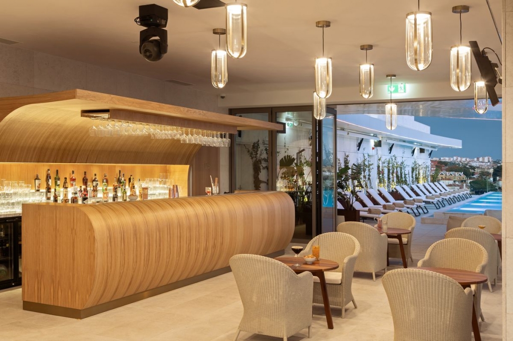 Amplo e iluminado pelos grandes vidros do chão ao teto, o átrio do Evolution Cascais-Estoril recebe os hóspedes não com a habitual receção, mas com o The Living Room Bar, de onde saem mocktails, cocktails clássicos e outros de assinatura como o Dolce Vita (beefeater dry, limoncello, xarope de maçã e canela, sumo de limão, clara de ovo e pistácio). A receção fica ao fundo e quase passa despercebida no espaço repleto de sofás, onde também é possível comer alguns snacks e petiscos. Entre quinta-feira e sábado um DJ ocupa a cabine de som.