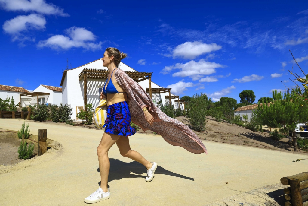 Camas exteriores produzidas por artesãos do Carvalhal; tapeçarias com design colorido; candeeiros feitos em contraplacado e fios de linho; arandelas de cerâmica da olaria de Melides; jarros e copos de uma olaria de Évora; e colchas indianas feitas com plástico PET são alguns dos objetos que se encontram nos quartos, cujas paredes lembram a textura das cabanas de terracota. “Foi tudo pensado para ser funcional e durável no contexto hoteleiro”, diz Duarte. As vilas, por seu turno, revelam um interior branco e minimalista.