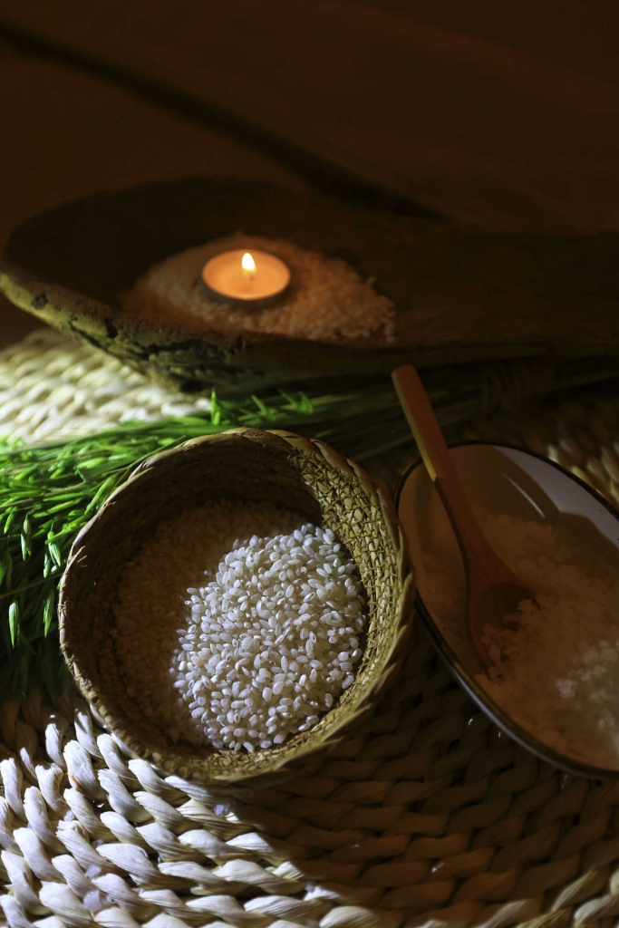 Colhido nos arrozais entre a Comporta e Melides, o arroz chega em estado puro às mãos de Filipa Santos para ser combinado – em bago e em pó obtido de forma artesanal – com óleos essenciais de base vegetal de grainha de uva, aveia, alfazema e flor de Ylang Ylang. “O arroz tem propriedades hidratantes, antioxidantes e calmantes para a pele e permite-nos criar uma experiência física e olfativa para o cliente, que assim toma contacto com uma das culturas mais representativas do Alentejo litoral”, introduz a consultora do Aura Spa.